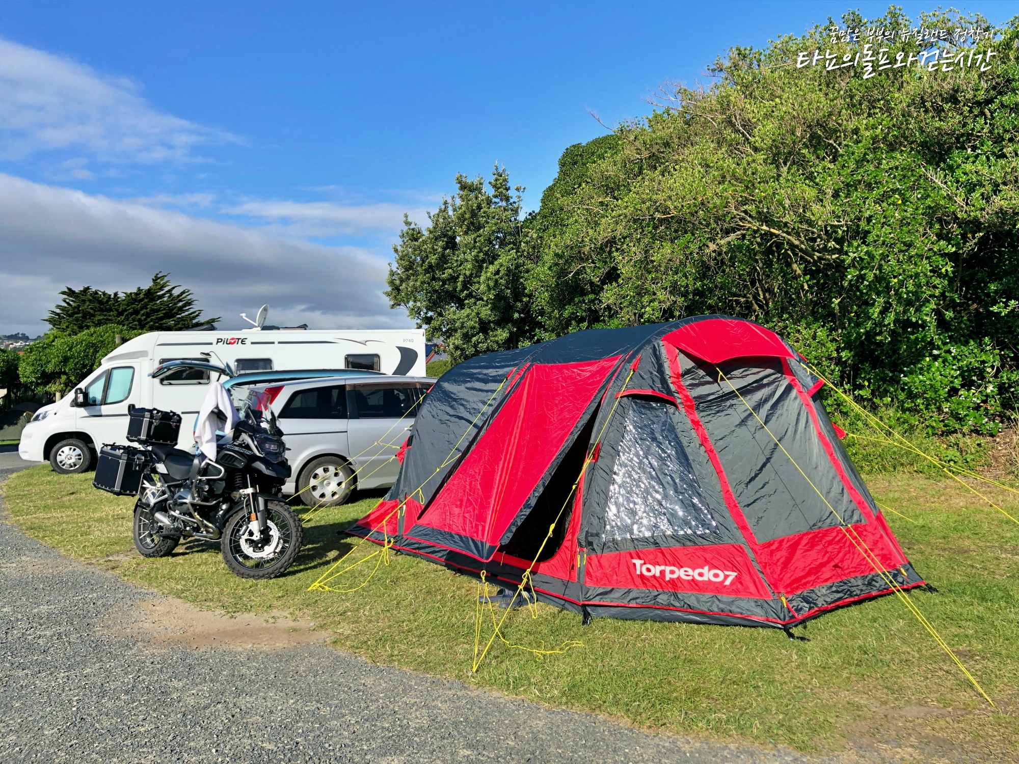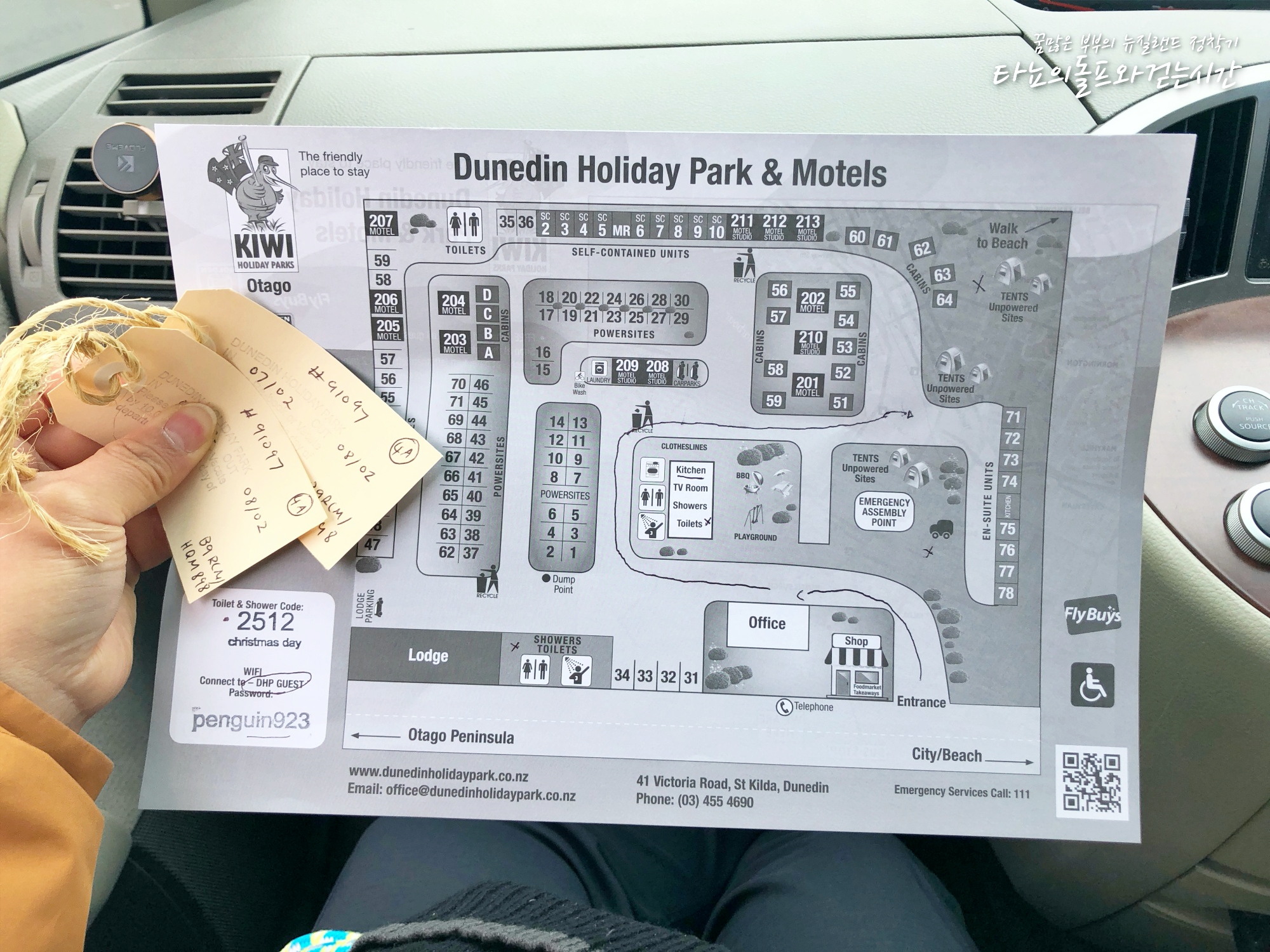 모에라키 바위와 카티키 등대를 잘 구경하고 1시간 7분을 달려 저희는 더니든 홀리데이 파크에 도착했어요. 캠핑 사이트를 미리 예약했었고 곧장 오피스로 들어가서 체크인을 했지요. 텐트에 묶어두라고 받은 표식과 홀리데이 파크 지도, 화장실 비밀번호를 받았어요. 비밀번호를 누르고 들어가는 화장실은 이 곳이 처음이었는데, 그만큼 정말 깨끗하게 관리가 잘 되었던 것 같아요.