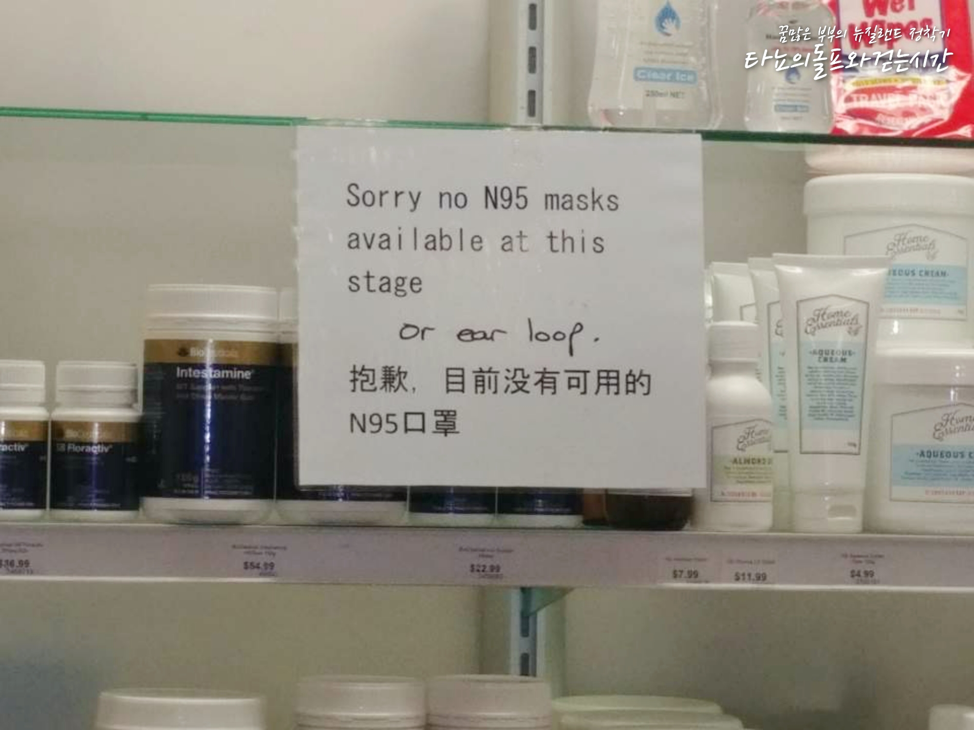 코로나 사태가 터지고 이 곳에서도 순식간에 마스크와 손세정제가 동이 났습니다. 정작 마스크가 필요한 직업군에 있는 사람들이 일할 때 필요한 마스크를 구입하지 못할만큼 여기도 마스크 대란입니다. 하지만 참 신기하게도 마스크를 쓰고 돌아다니는 사람은 아직까지 거의 없습니다. 간혹 중국인들이 마스크를 쓰고 다니긴 하지만, 키위들을 포함한 대부분의 사람들은 마스크를 쓰지 않아요.
