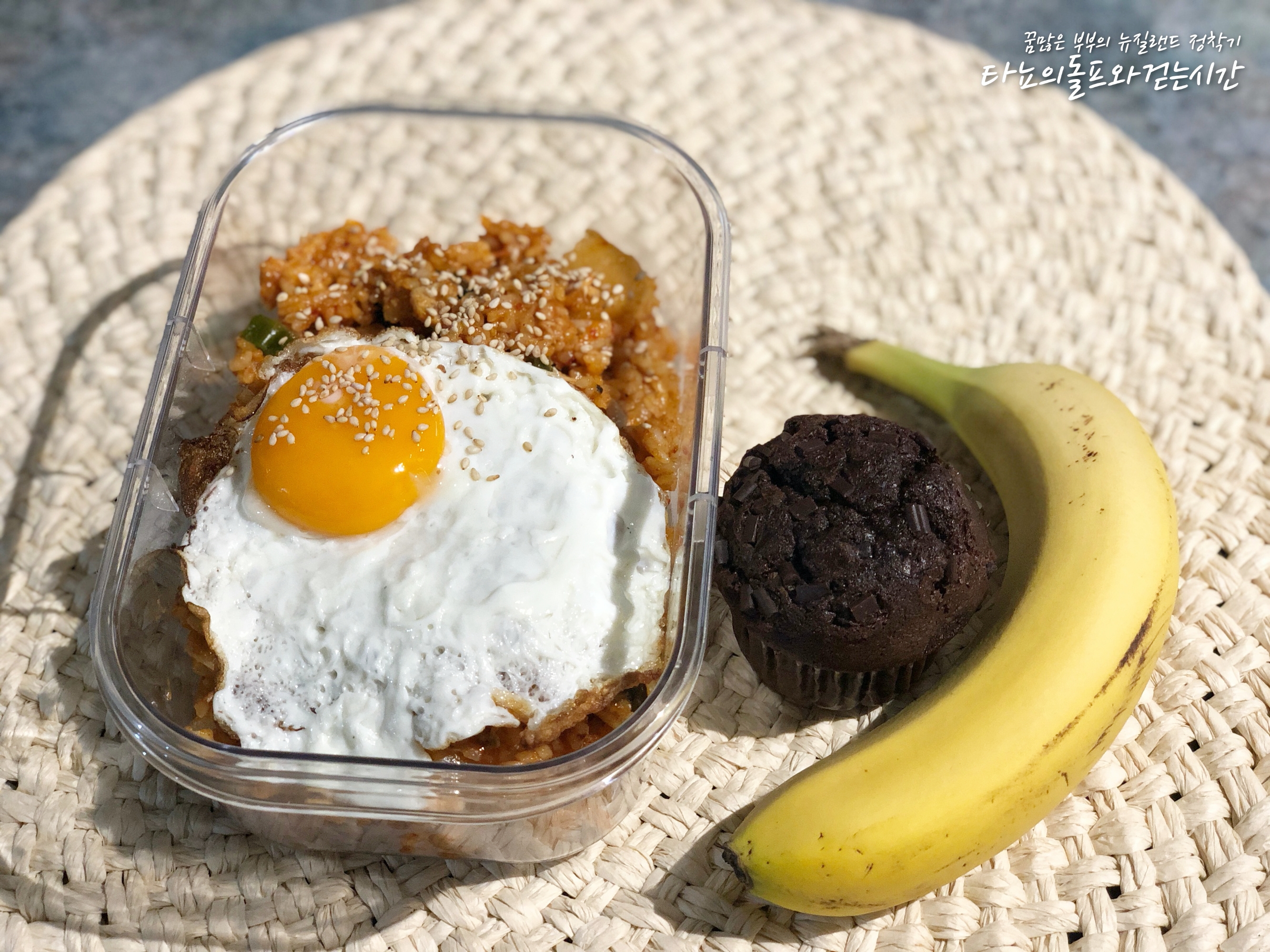 삼겹살 듬뿍 넣어서 준비한 김치볶음밥이에요. 김치와 삼겹살은 최고의 조합이라고 생각합니다. 참기름까지 넣어주면 금상첨화죠. 바나나와 초코머핀은 간식!