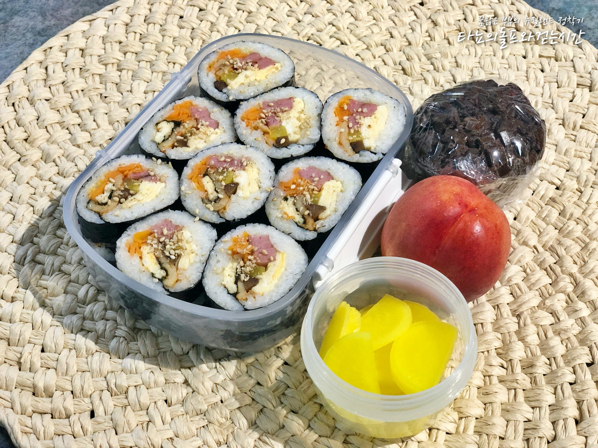 냉장고에 있는 재료로 후다닥 만든 김밥이에요. 초록 나물이 없어서 색깔조합이 좀 안맞다만, 그래도 맛은 좋았답니다. 매콤하게 만들어둔 어묵볶음을 넣었더니 더 맛이 좋더라고요. 김밥이 약간 심심한 것 같아서 단무지 조금 준비하고 간식으로 초코머핀이랑 복숭아 챙겼어요.