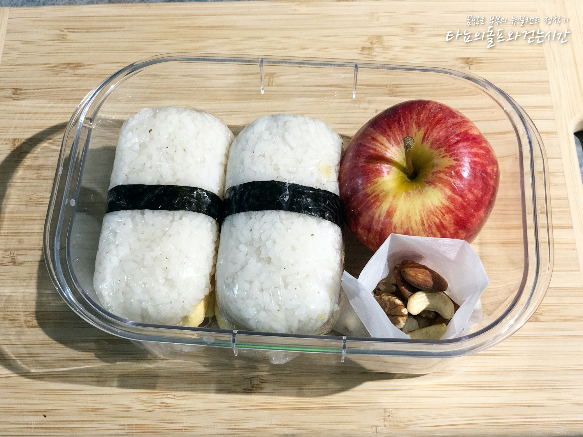간단하게 먹기 좋은 스팸무스비 준비했어요. 달걀, 스팸, 치즈 넣고 밥은 소금이랑 참기름 넣어서 밑간을 맞췄답니다. 사과와 견과류는 간식!