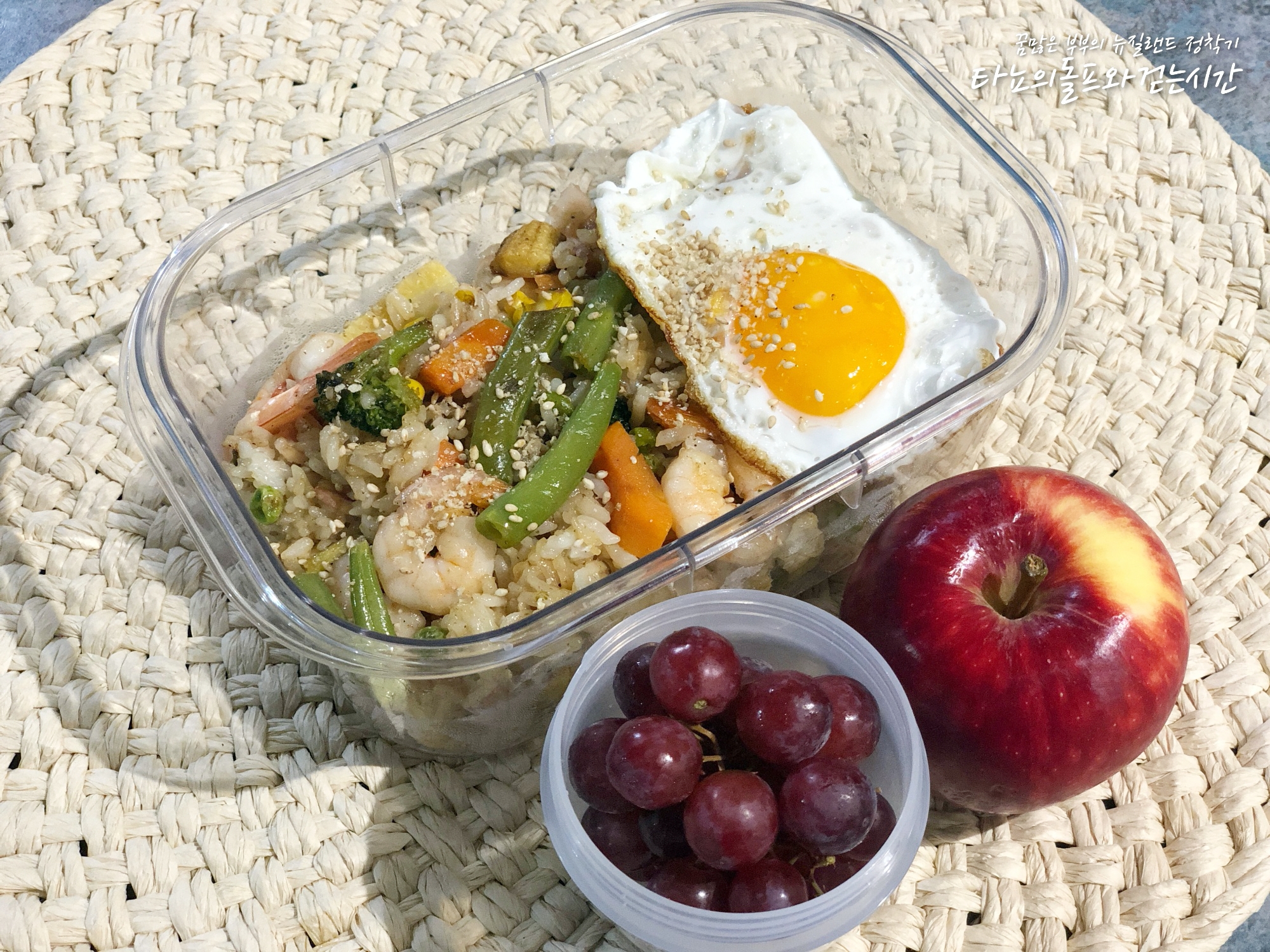 새우 듬뿍 넣어서 만든 새우 볶음밥이에요. 모듬야채 듬뿍 넣어서 간장으로 간을 봤어요. 사과랑 씨없는 포도는 간식!