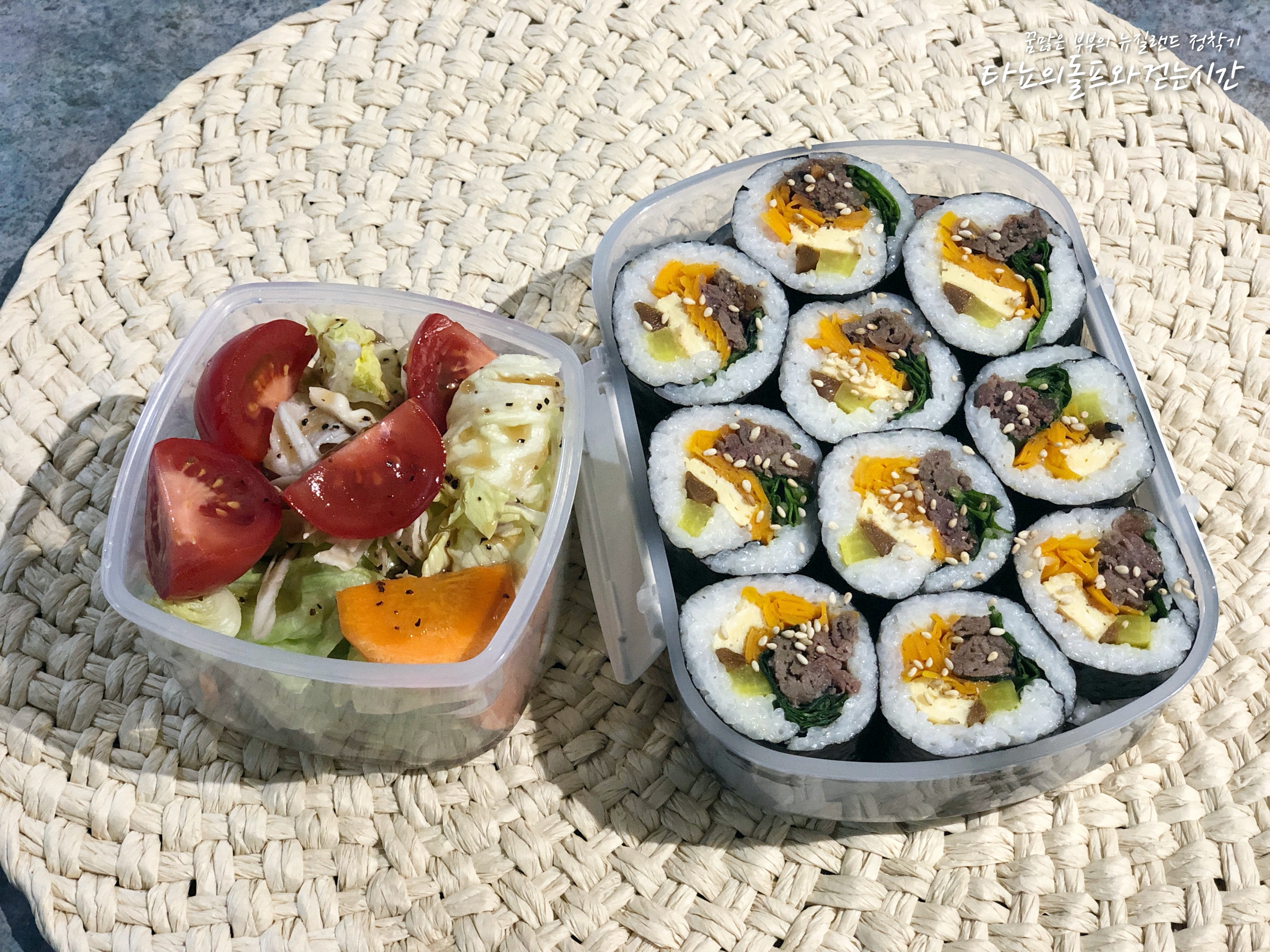 소불고기 김밥을 준비했어요. 불고기 남은 것이 있었는데 김밥에 넣어도 너무 맛있더라고요. 토마토 얹은 샐러드 함께 준비했어요.