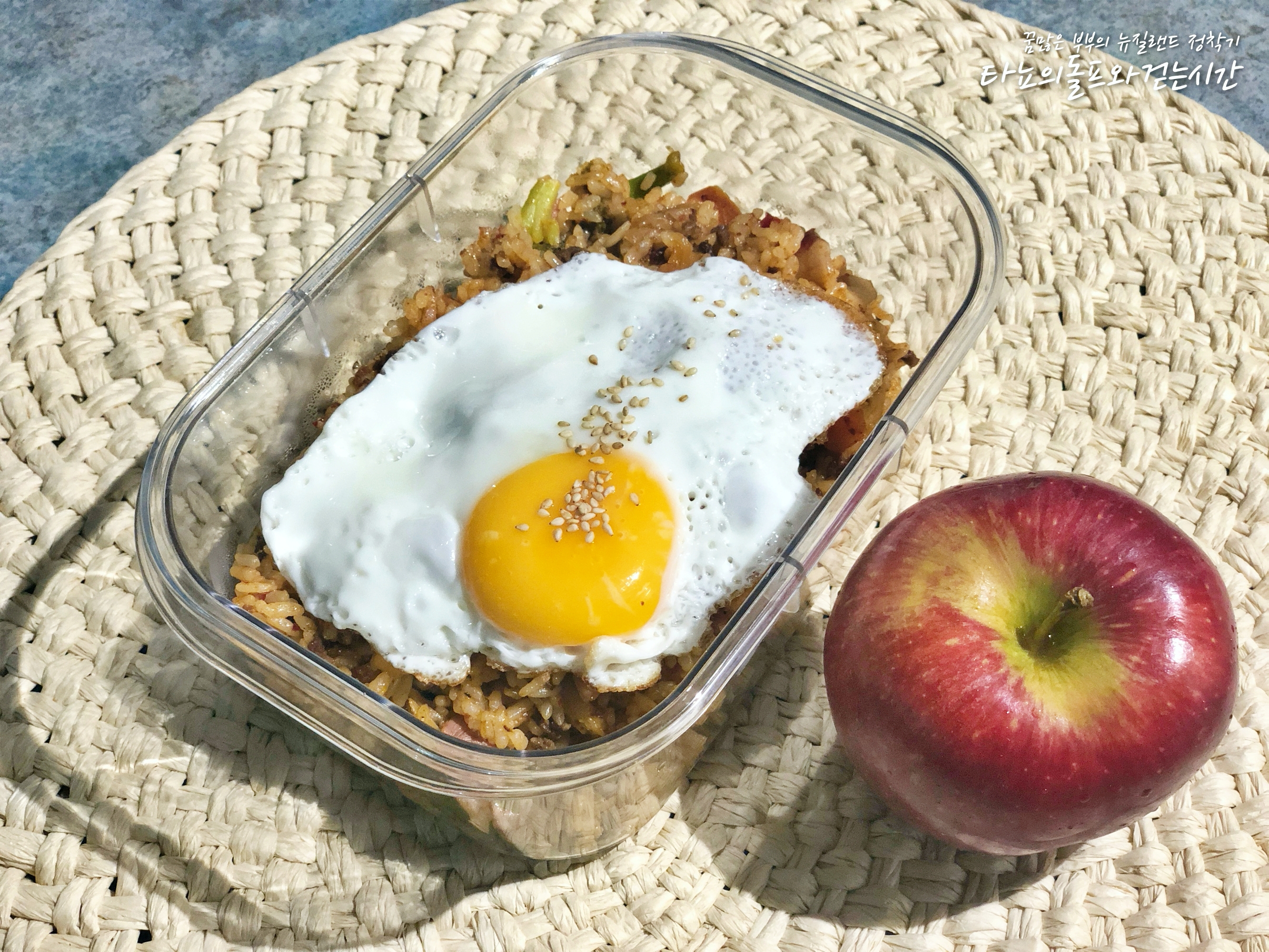 달걀프라이 얹은 스팸 김치볶음밥이에요. 브로콜리, 빈, 완두콩, 당근, 콜리플라워 함께 넣어서 준비했어요. 김치볶음밥에 김치만 들어가라는 법은 없지요. 간식으로는 사과!