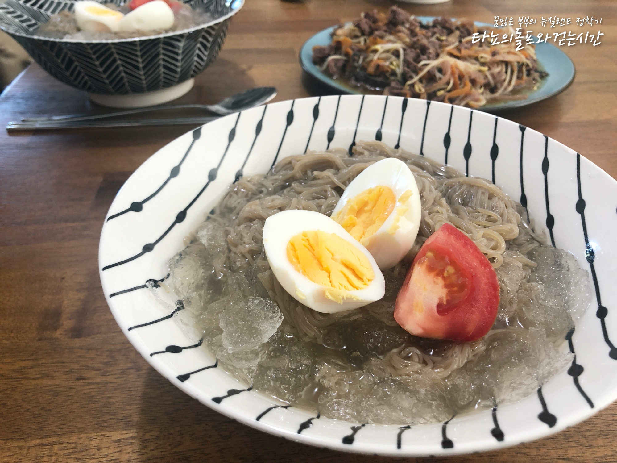 이런 더위를 느끼는 날에는 시원한 물냉면이 최고죠. 육수 살짝 얼려서 살얼음지게 만들고 달걀, 토마토 얹어서 맛나게 먹었습니다. 육쌈냉면이 그리워서 소고기 숙주볶음도 함께 준비했어요. 갈비가 제 맛이지만, 갈비는 없고 저거라도 얹어서 먹었습니다.