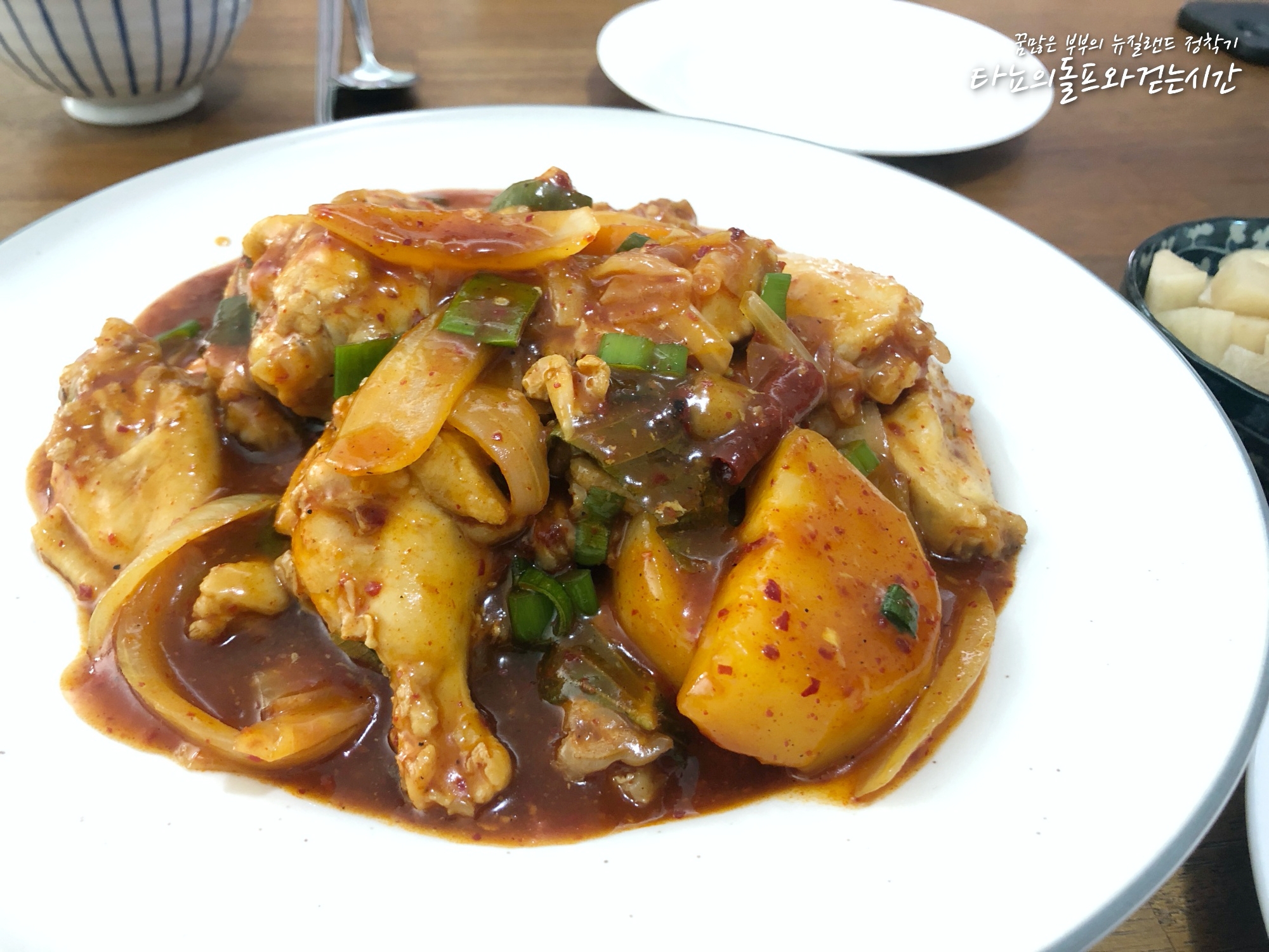 찜닭을 좀 넉넉하게 했어요. 그래서 함께 사는 플랫 친구들도 모두 함께 먹었던 날입니다. 늘 국물을 농도 짙게 마무리하는게 어려웠는데 이번에는 잔꾀를 내어서 전분물을 부어 마무리했더니 아주 걸죽하게 만들어졌답니다. 당근, 감자, 양파, 대파, 깻잎까지 넣어서 더욱 맛있는 찜닭이 되었네요. 간은 간장과 고추장을 반반으로 섞어서 맞췄어요.