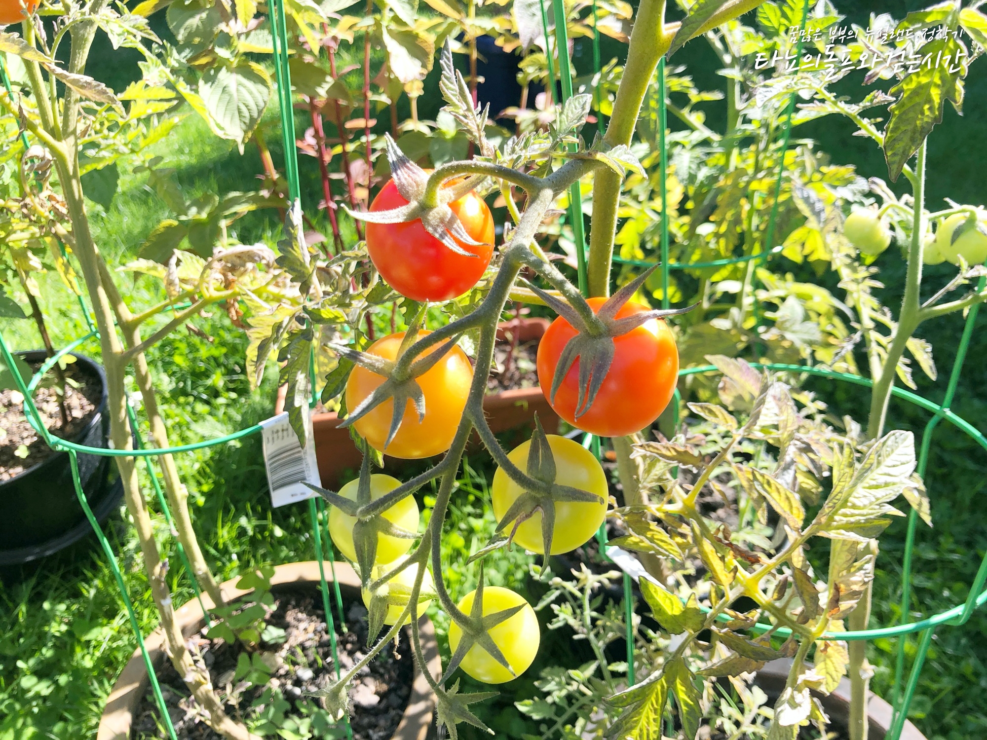 에휴, 이녀석들은 언제 따먹을 수 있을까 싶었는데, 드디어 몇 개 따먹을 수 있게 되었네요. 작년 10월? 언니가 잠시 왔을 때 잘 익은 토마토를 썰어서 화분에 심었었어요. 그 것이 봄에 싹을 틔우고 자라기 시작해서 지금까지 키웠는데요. 이번 여름은 유난히 날씨가 좋지 못했고 게다가 저희집 정원이 햇살이 그리 많이 들어오는 편이 아니라서 결국 열매를 많이 맺지 못했어요. 몇개월 걸린건가요. 4개월만에 이제 겨우 토마토 4개 따먹었습니다.