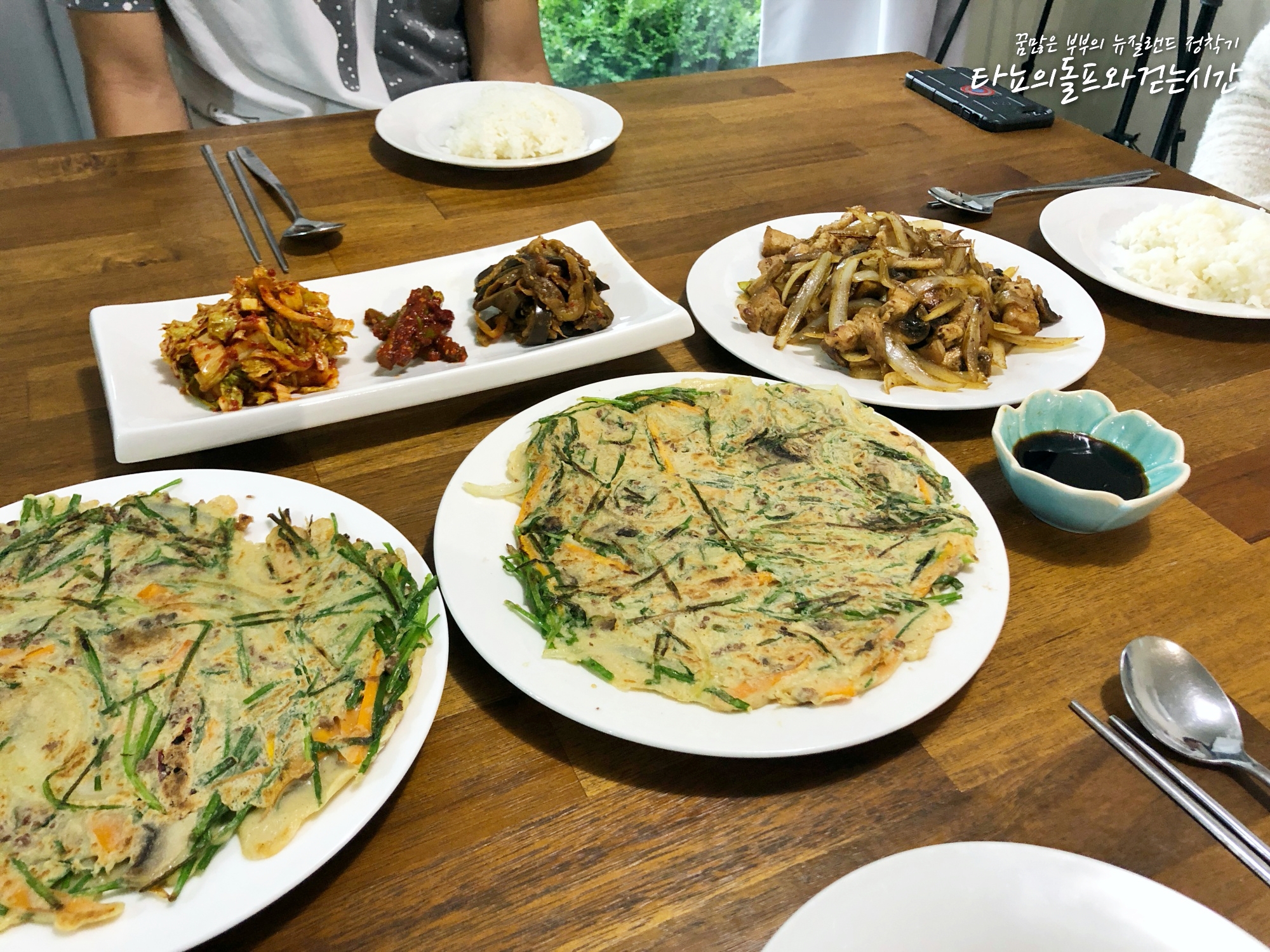 부추가 풍년이라 부추전을 종종 구워 먹고 있습니다. 양파랑 당근 썰어 넣어 함께 구우니 더 맛있네요. 배추나물은 엄마가 해주시던 맛이 생각나서 종종 시도하는데, 엄마가 해주시던 맛은 절대 나지 않아서 참 섭섭하네요. 그 맛이 날 때까지 시도해봐야겠어요.