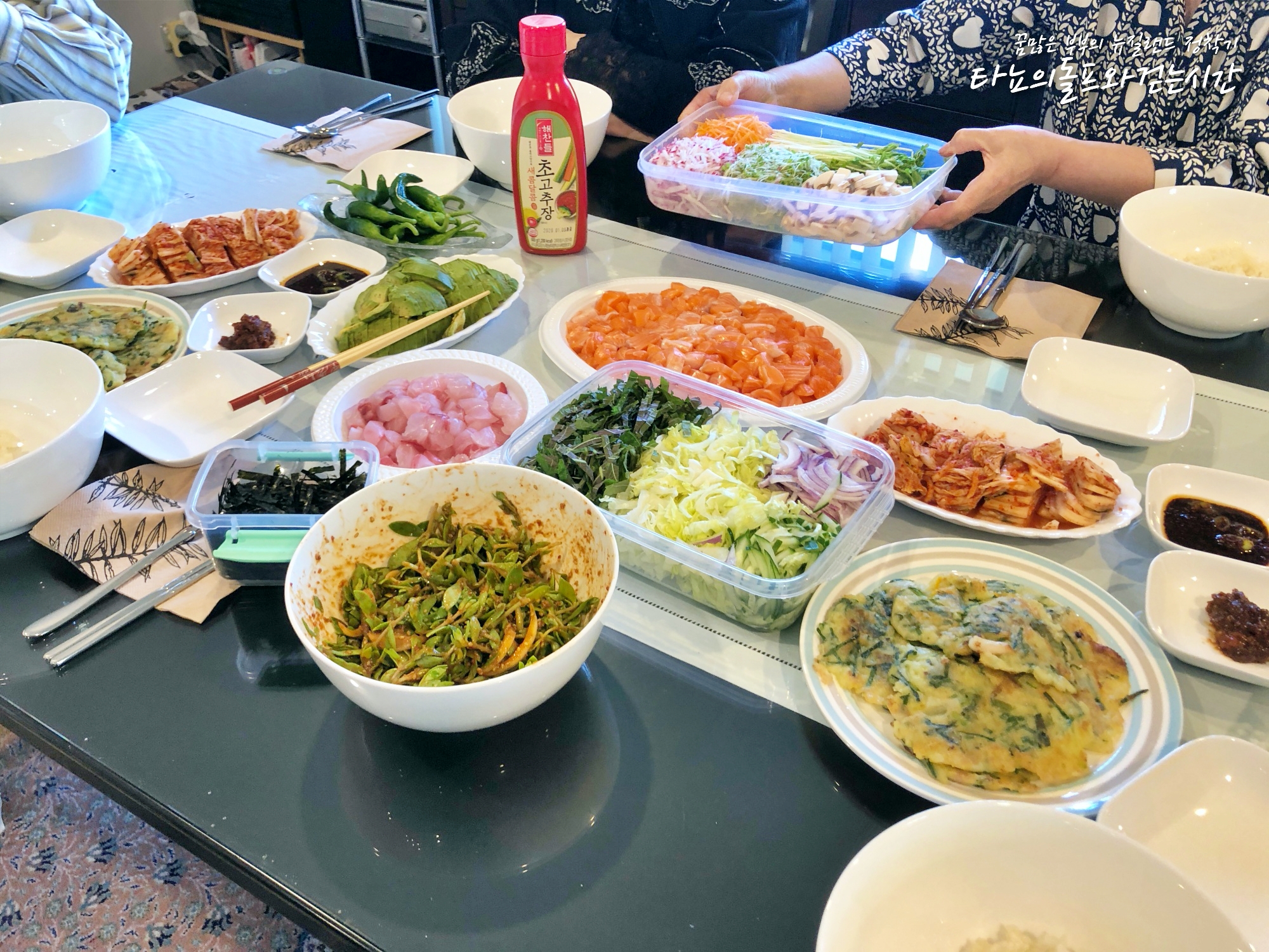 해산물 못 먹는 우리 신랑은 어쩌겠어요. 처음 식사 모임을 가졌던 분들이라 저희 신랑 해산물 못먹는거 모르시더라고요^^ 덕분에 육식쟁이 우리 돌프는 간만에 완전한 채식을 했답니다. 건강에 아주아주 좋았을 것 같아요. 사진 속 홍합오징어전과 연어는 제가 다 먹었지요~