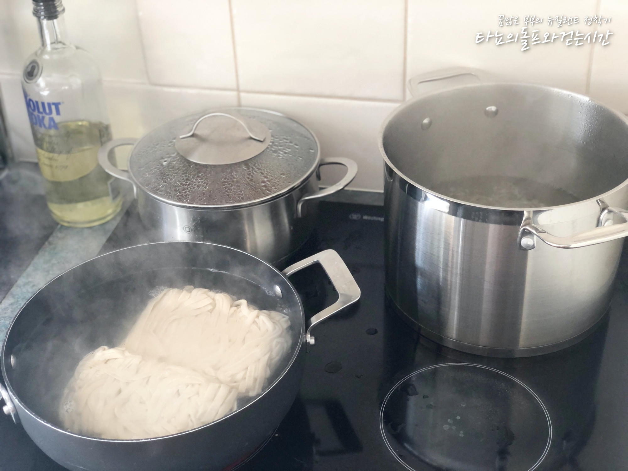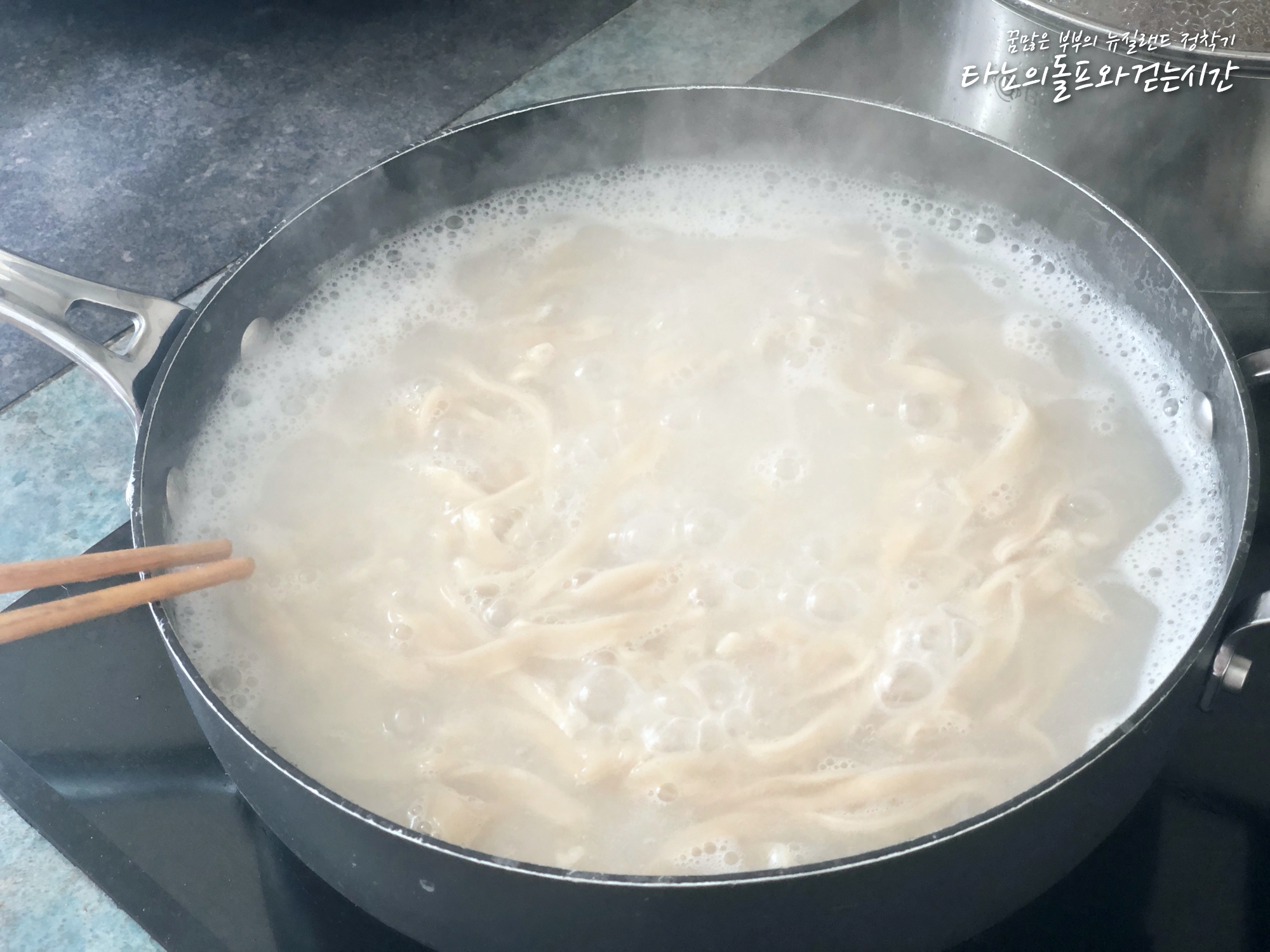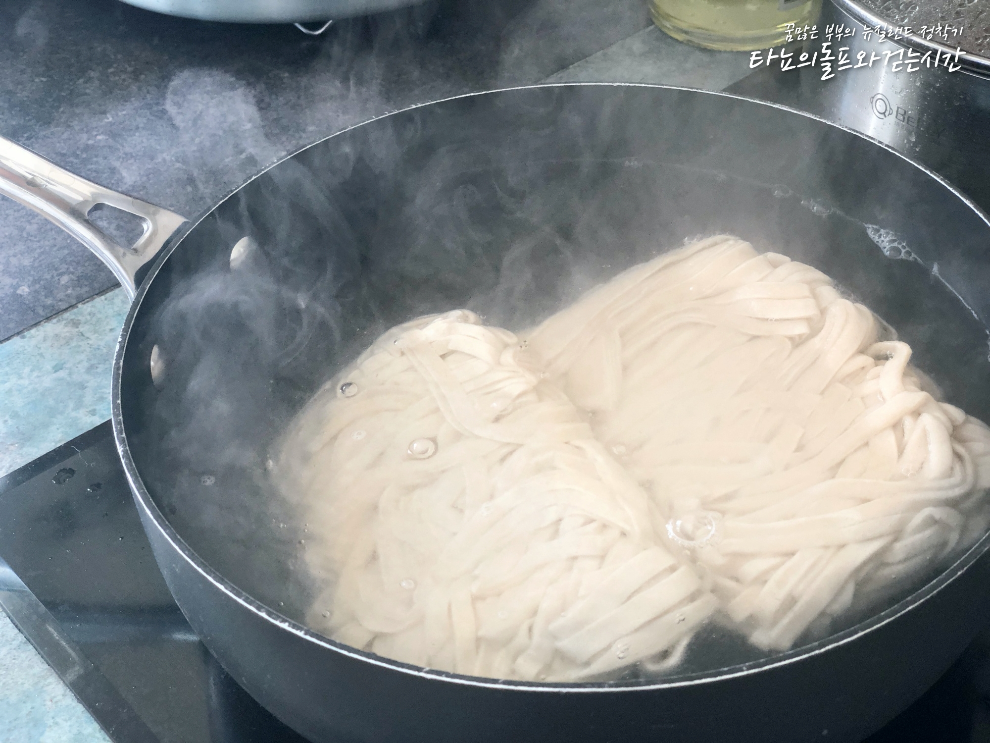 전기포트로 물을 끓여서 사용하면 조리 시간이 조금 더 빨라지는 것 같아서 저는 보통 전기포트를 사용합니다. 끓는 물에 꽁꽁 얼은 칼국수를 퐁당퐁당 넣어줬어요.