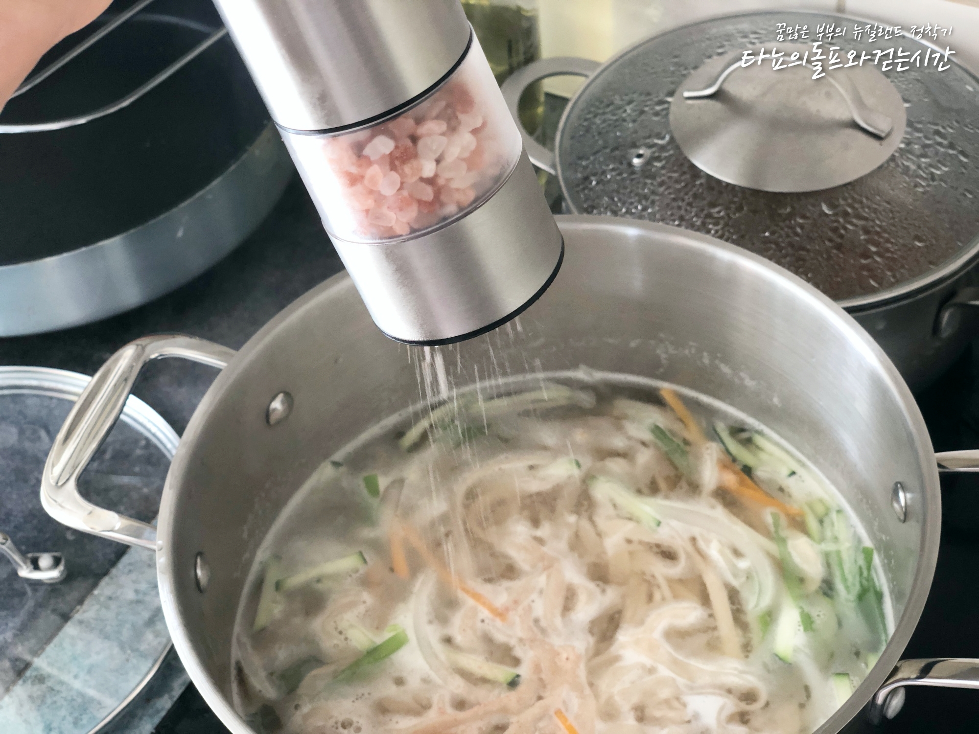한쪽에서 칼국수를 초벌로 삶을 때 다른 한쪽에서는 육수를 끓였습니다. 육수는 1.5L 물에 다시 백(다시마, 말린 양파, 멸치) 넣어서 끓였어요. 육수가 팔팔 끓으면 불을 약불로 낮춰주세요. 면이 다 삶길 때까지 일단 육수는 항시 대기하는 겁니다.