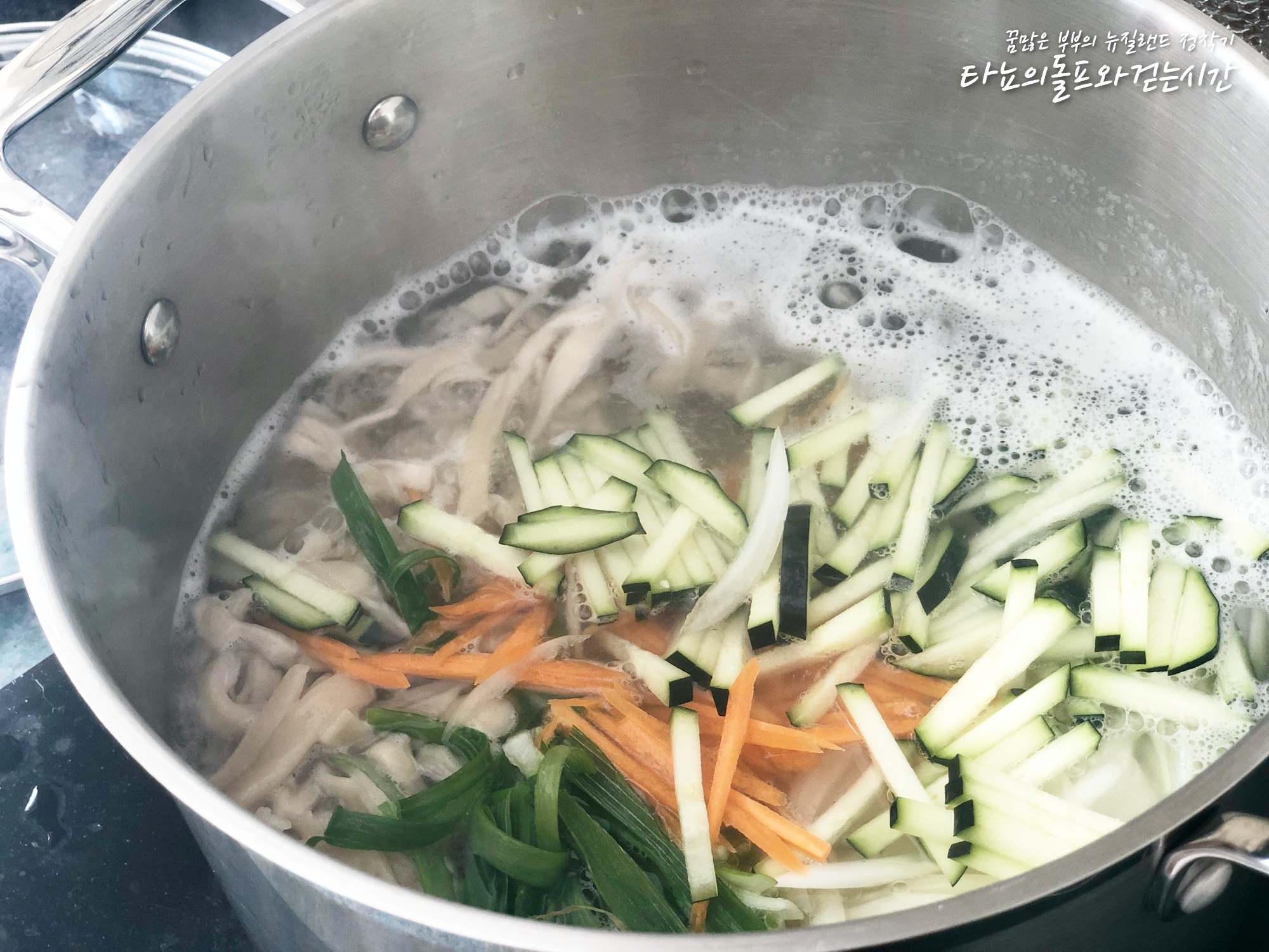 양파, 호박, 당근, 대파 골고루 채 썰어 준비했어요. 야채는 마지막에 넣지만, 미리 준비해두면 손이 덜 분주해서 일이 수월합니다.