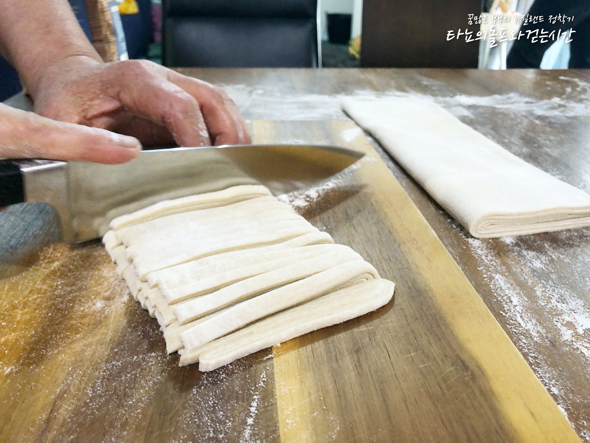 엄마는 언제나 말을 실천으로 옮기시는 분이죠. 마음에 걸리는 것이 있다면 액션을 취해야 합니다. 엄마와 저는 함께 지낼 때도 칼국수를 참 자주 만들어 먹었었는데, 언제나 엄마가 만들어 주시면 저는 맛있게 먹었었죠. 이 곳에서 함께 지낸 지난 두 달 동안 엄마가 손칼국수 참 많이 밀어주셨는데요. 가는 마당에도 막둥이 먹을 칼국수가 신경 쓰이셨던 엄마는 팔을 걷어붙이고 밀가루 반죽을 하셨습니다.