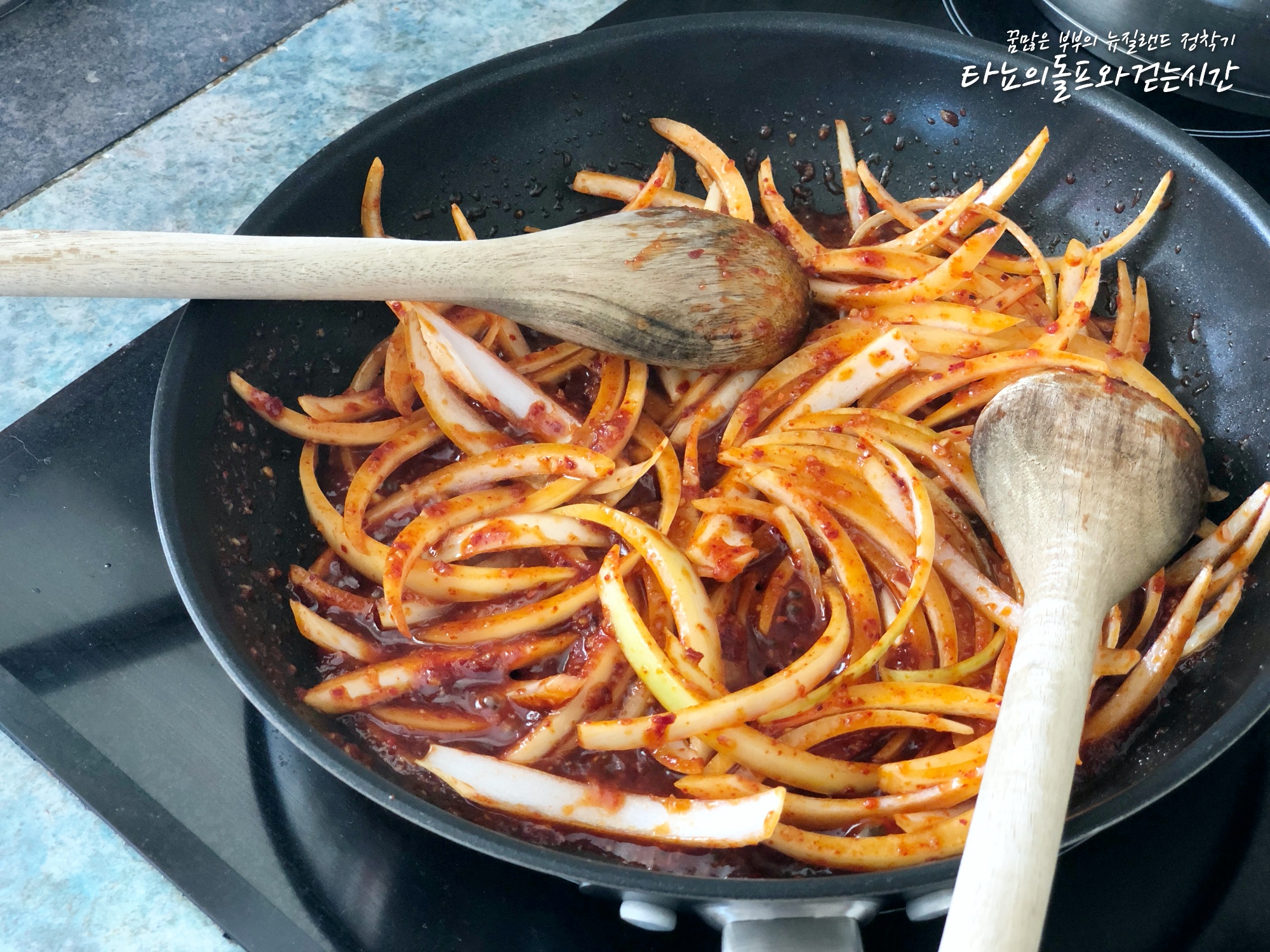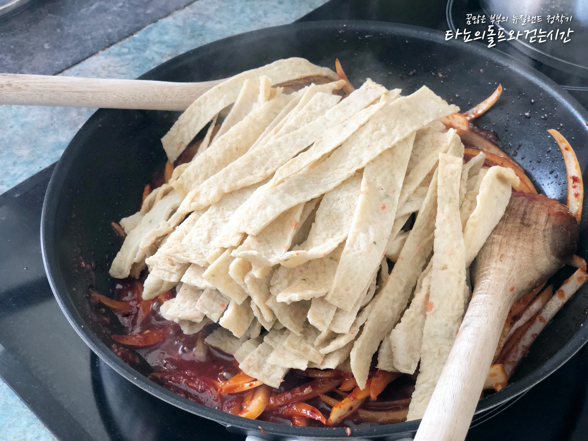 4. 양파 위에 어묵을 넣고 잘 섞어서 잠시 볶아주세요.(저는 어묵 넣을 때 식용유 한 번 둘렀어요)