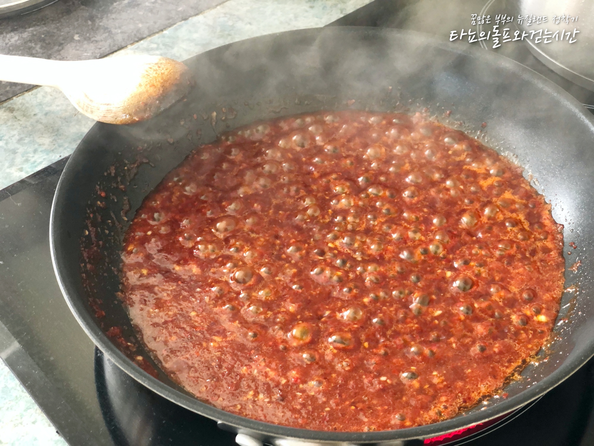 2. 먼저 모든 양념 재료를 팬에 넣고 끓여주세요.