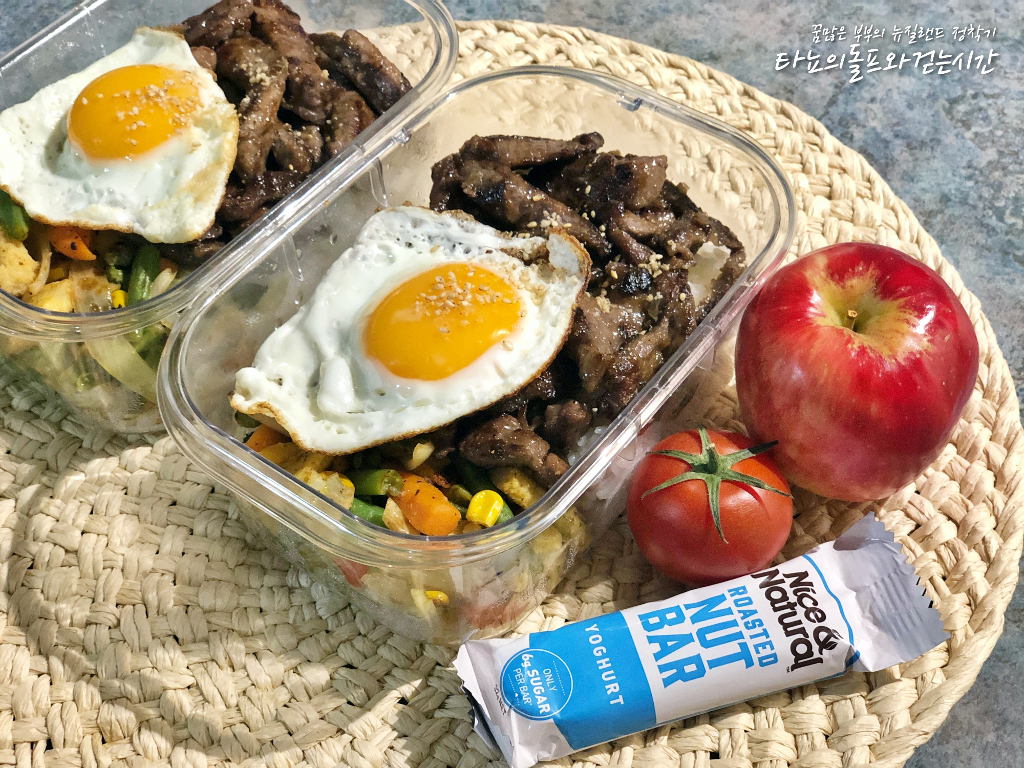 퍽퍽한 부위를 구입하더라도 전분가루에 반죽하면 금새 부드럽게 조리가 가능하죠. 볶음용 소고기 구입해서 전분가루와 간장으로 간을 맞춘 다음 야채 함께 볶아서 밥 위에 얹었습니다. 사과와 토마토, 너트 바는 간식!