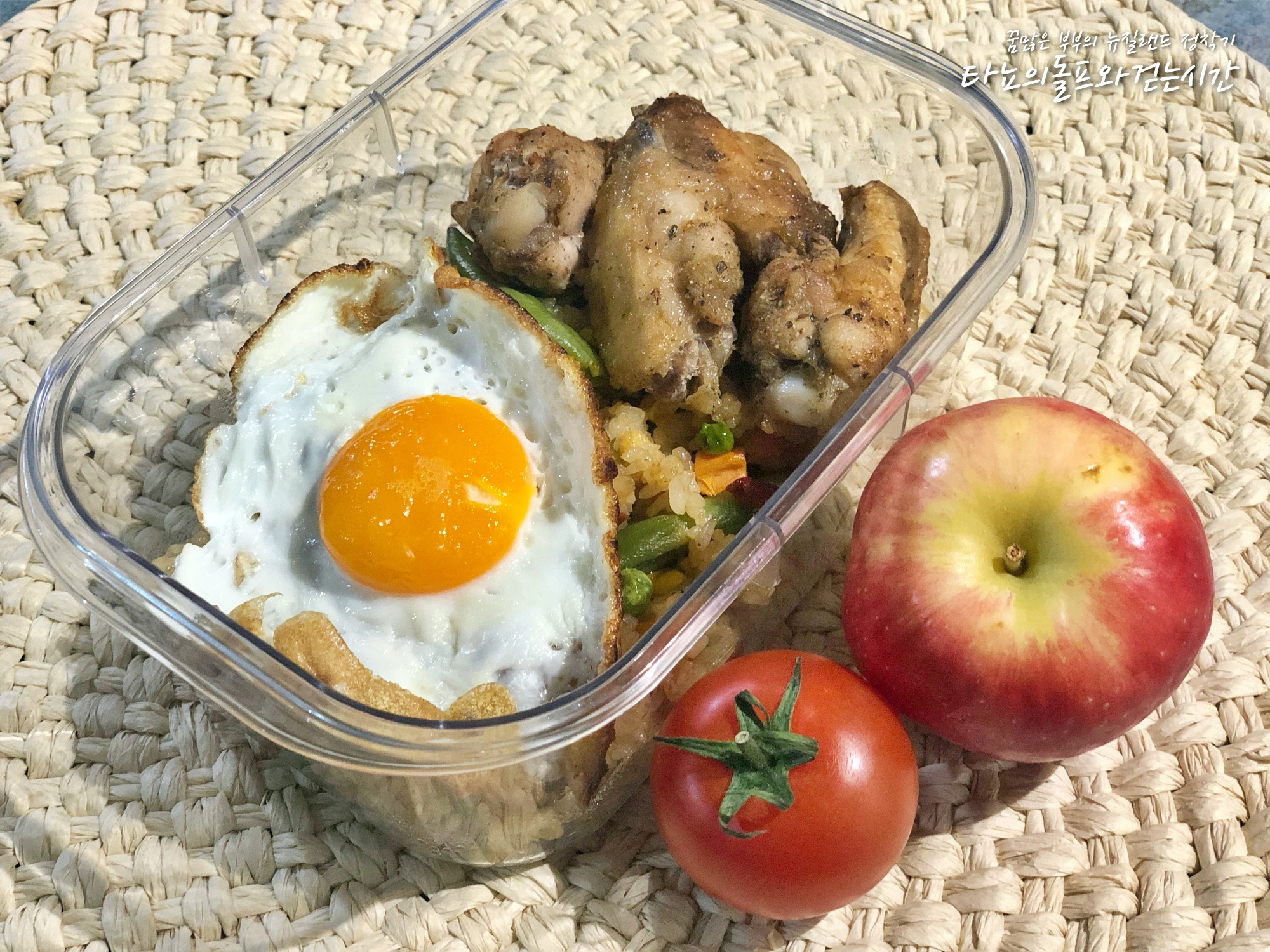 야채만 들어간 야채 볶음밥 위에 오븐치킨으로 닭봉과 닭날개 대여섯 개 얹어서 준비했습니다. 사과와 토마토는 간식!