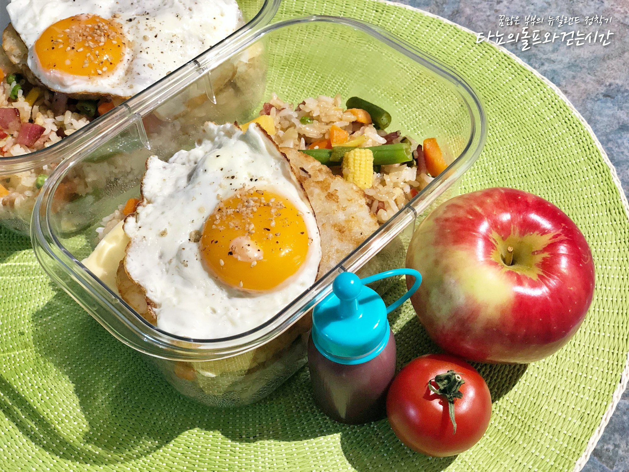 집에 고기가 하나도 없어서 베이컨 듬뿍 넣어서 볶음밥 준비했어요. 모듬 야채 듬뿍 넣어서 볶음밥 만들고 그 위에 치즈 1장, 해시포테이토, 달걀프라이 얹었습니다. 해시포테이토에 뿌려 먹으라고 작은 케첩 통도 준비했어요. 사과랑 토마토는 간식!