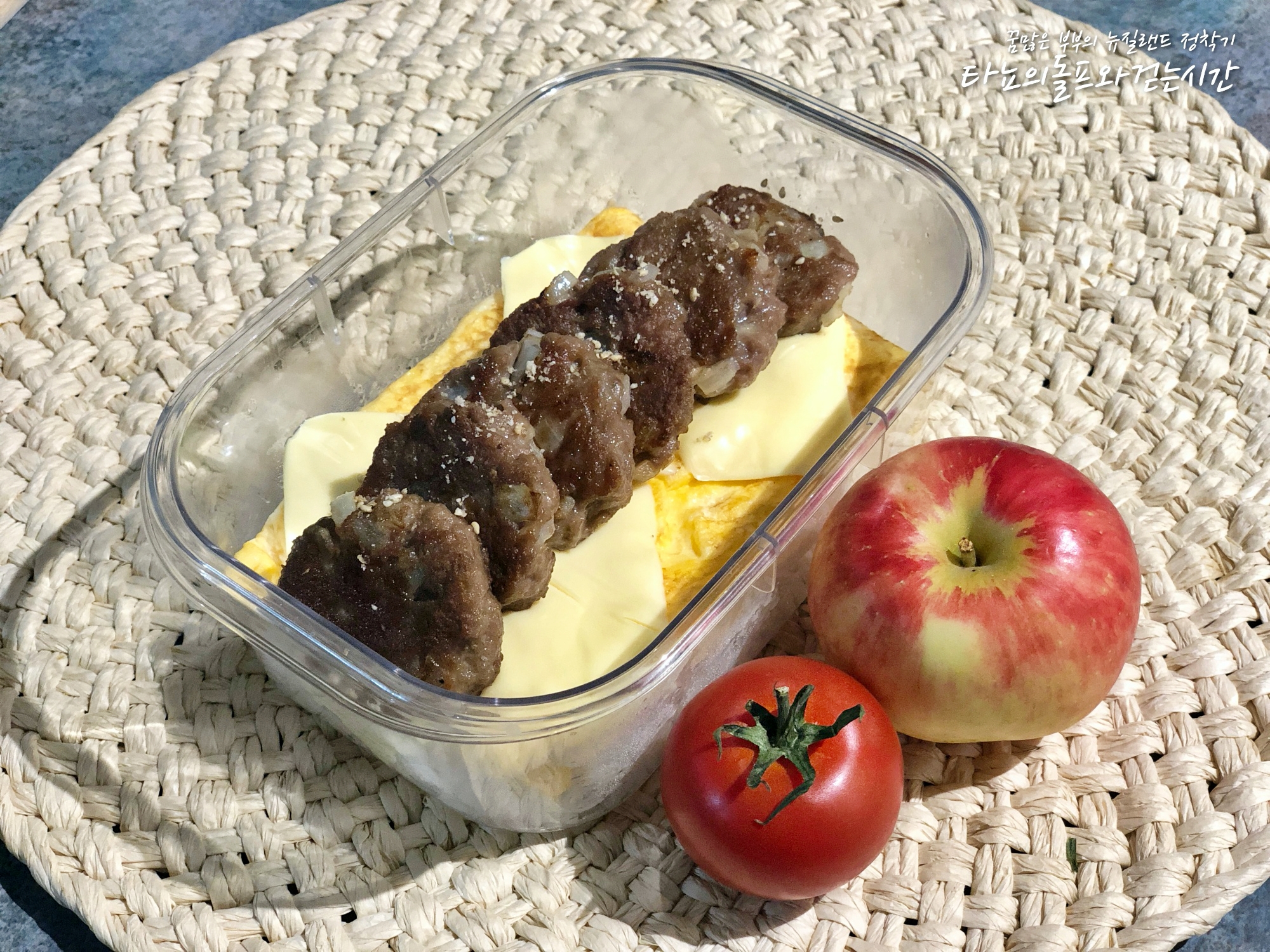 떡갈비를 좋아하는 두 남자를 위해 떡갈비 도시락을 만들었지요. 밥 위에 달걀 프라이, 치즈, 떡갈비 순으로 차곡차곡 올렸습니다. 간식으로는 토마토와 사과입니다. 떡갈비는 넉넉하게 만들어서 냉동 보관해도 좋아요.