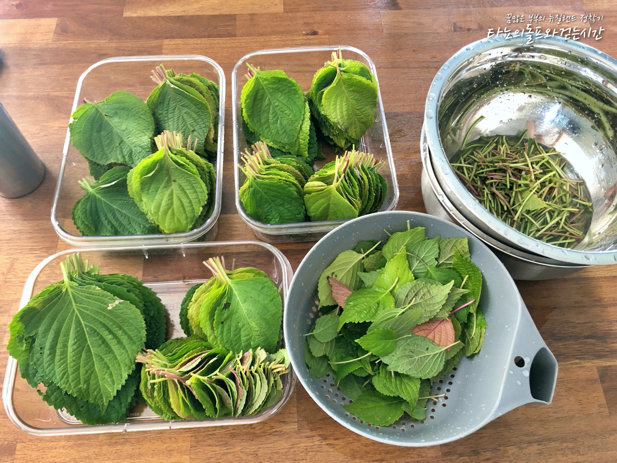 올해만 세 번째 만드는 양념 깻잎지입니다. 코비드19으로 시간이 멈춘 듯 온 거리가 조용해졌지지만, 시간은 열심히 달리고 있었습니다. 어느새 저희 집 뒷마당에도 가을이 찾아와서 텃밭에서 키우던 온 작물들이 울긋불긋 단풍 들고 조금씩 말라가기 시작했습니다. 깻잎은 씨가 가득 맺히고 잎이 마르기 시작했지요.