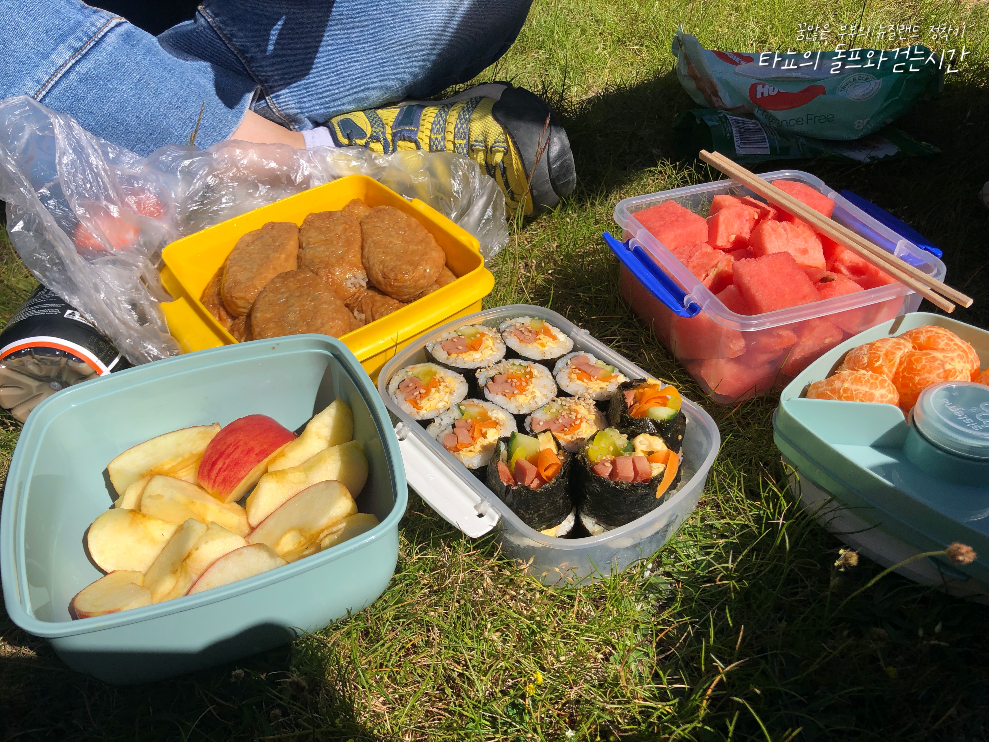 집에서 10시에 출발, 도착한 시간은 11시였지만, 가방이 무거웠던 저희는 일단 점심부터 먹었습니다. 아기띠로 아기를 안고 있는 언니는 아무래도 그 무게가 더 크게 느껴졌을 것 같습니다. 언니는 소고기 유부초밥과 사과, 귤을 준비했고 저는 김밥과 수박을 준비했어요. 김밥 2통을 준비했지만, 이것도 너무 많아서 결국 꺼내지 않았답니다 ^^;; 아침에 늦잠 자서 허겁지겁 만든 김밥 치고는 맛은 괜찮았던 것 같아요. 아마도 스팸 덕분이겠죠?