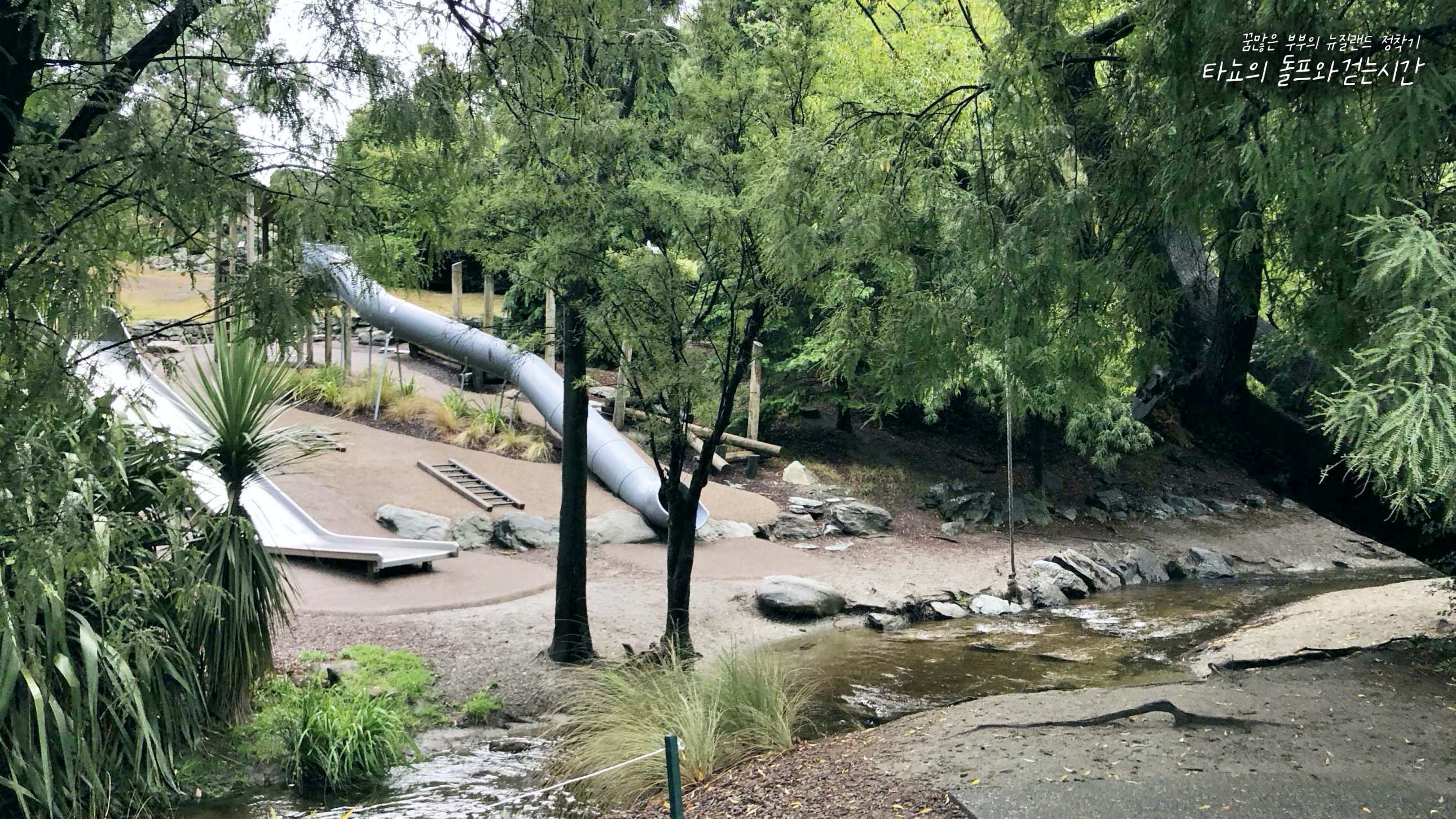 돌아 돌아 건너편 놀이터로 갔지요. 미끄럼틀이 워낙 길어서 타고 싶었는데, 다 젖어서 탈 수가 없었어요.