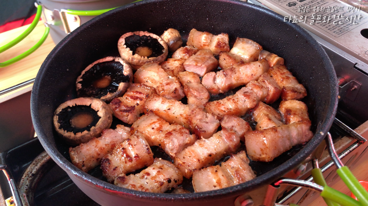 캠핑할 때는 역시 먹는게 가장 즐겁죠. 마트에서 사 온 삼겹살 지글지글 구워서 버섯이랑 맛있게 뇸뇸했습니다.