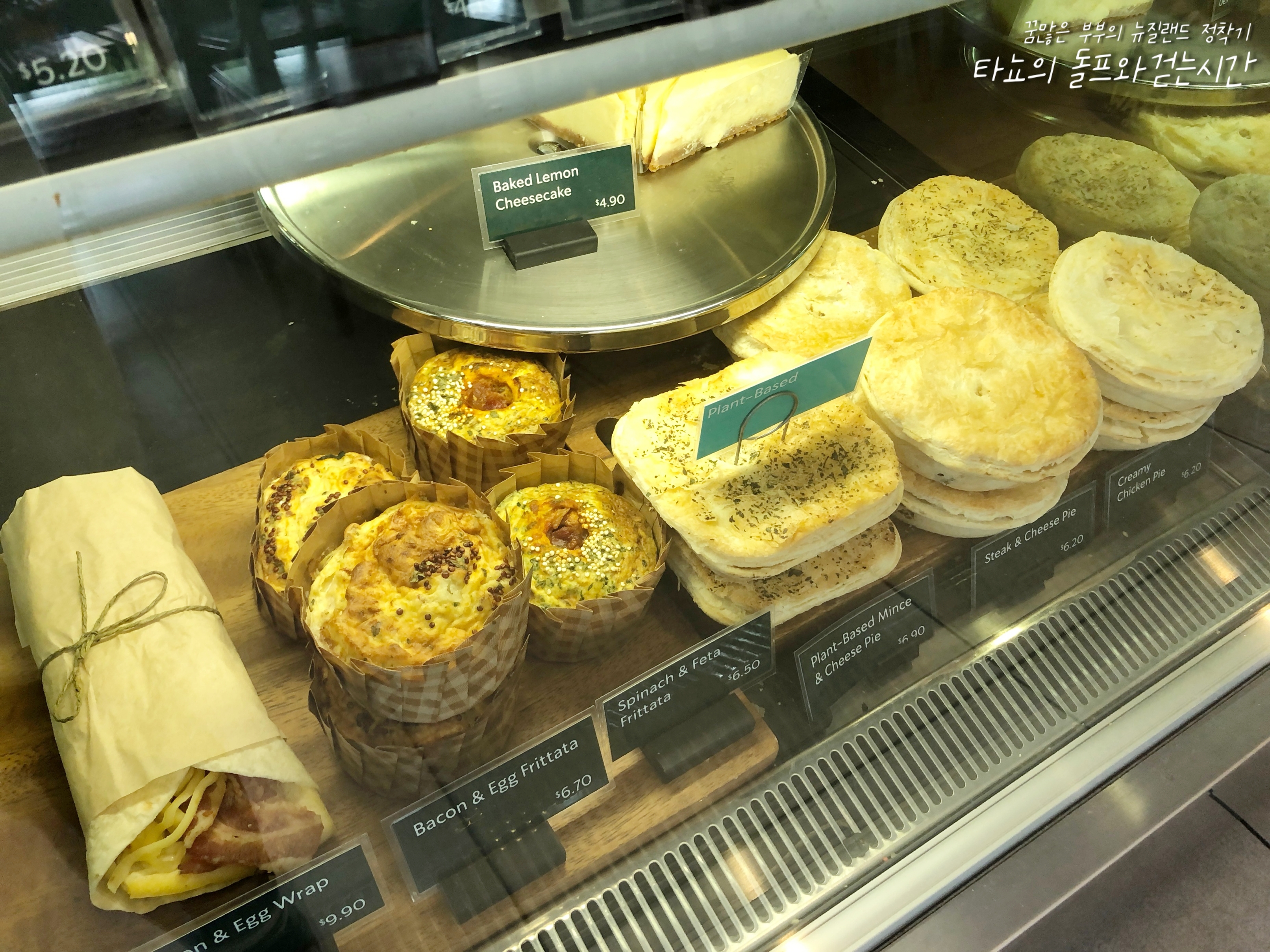 따뜻한 음식이 들어있는 캐비넷에는 베이컨&에그 랩, 베이컨&에그 프리타타, 스페니치&페타 프리타타, 민스&치즈 파이, 스테이크&치즈 파이, 크리미 치킨 파이가 준비되어 있었어요. 프리타타는 한국에서도 많이 먹는지는 잘 모르겠지만, 여기서는 카페서 많이 판매하는 것 같아요. 베지테리언들을 위해서 베지 프리타타를 판매하는 카페도 종종 있어요. 프리타타는 간단하게 달걀찜이라 생각하시면 될 것 같아요.