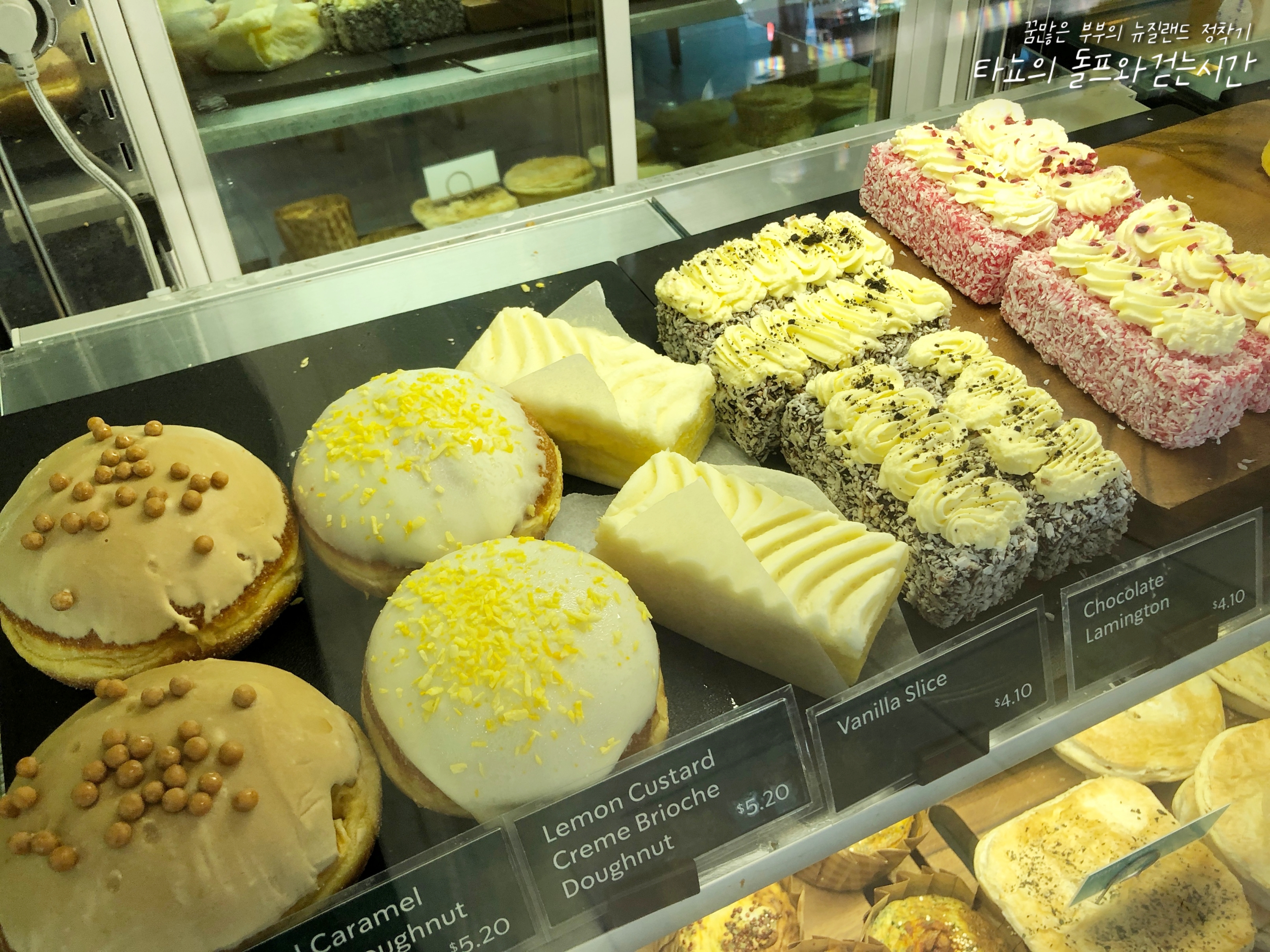 카라멜 브리오슈 도넛, 레몬 커스터드 브리오슈 도넛, 바닐라 슬라이스, 초콜릿 래밍턴, 스트로베리 래밍턴이 캐비닛 상단에 나란히 진열되어 있었습니다. 브리오슈는 굉장히 식감이 부드럽고 약간 쫀득한 빵인데 제가 느꼈던 맛은 파리바게트의 굿모닝롤이나 후레쉬번과 비슷한 느낌이었던 것 같아요. 보통 브리오슈로 샌드위치를 만드는 곳이 많은데 이렇게 도넛류로 진열된 건 저도 처음 봤습니다. 맛이 궁금했어요.