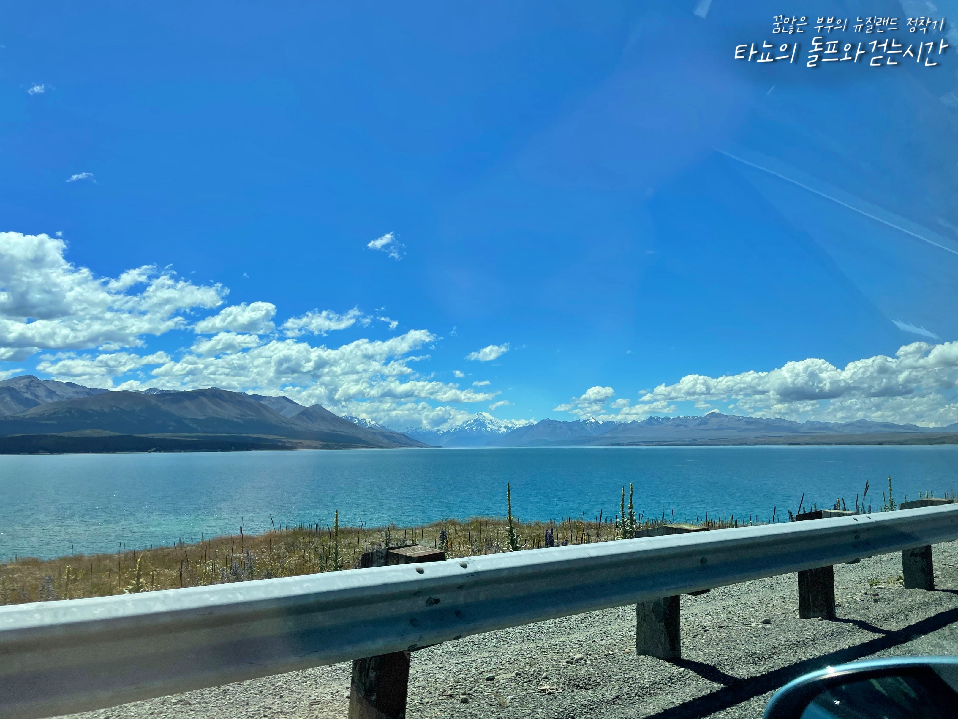 트와이젤을 지나 푸카키 호수를 지날 때입니다. 날이 너무 좋아서 멀리 마운트 쿡 봉우리가 보이네요. 사진의 중심에 만년설이 있는 산 봉우리가 마운트 쿡입니다. 저래뵈도 엄청 먼 거리에 있는 마운트 쿡이에요. 여기 날씨가 좋아도 보통 저 안 쪽은 날씨가 엉망일 때가 많은데요. 이 날은 운이 참 좋았습니다.