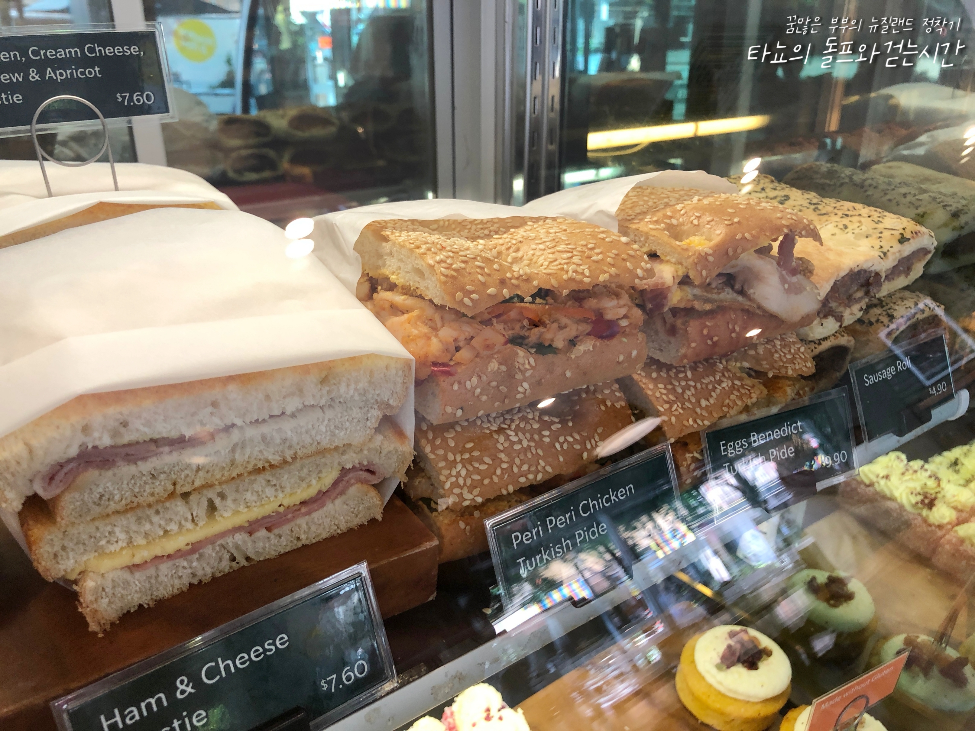 햄&치즈 토스티, 페리페리 치킨 터키쉬 피데, 에그 베네딕트 터키쉬 피데, 소세지롤이 진열되어 있네요. 햄&치즈 토스티나 소세지롤도 뉴질랜드 카페에서는 보통 흔하게 볼 수 있는 메뉴예요. 식빵 안에 진짜 간단하게 햄과 치즈만 들어간 게 햄치즈 토스티고 이걸 주문하면 보통 토스터에 구워주는 편입니다.
