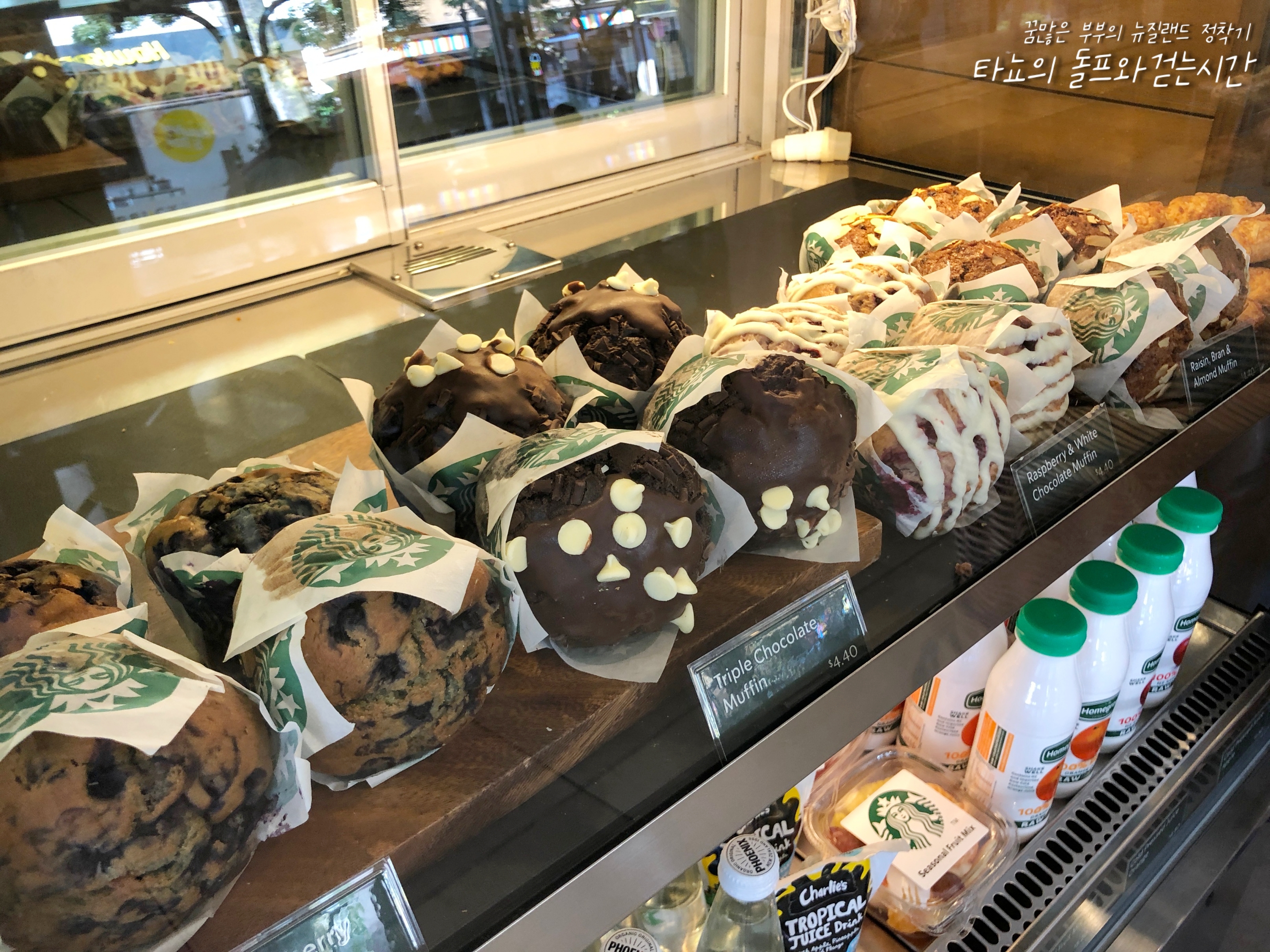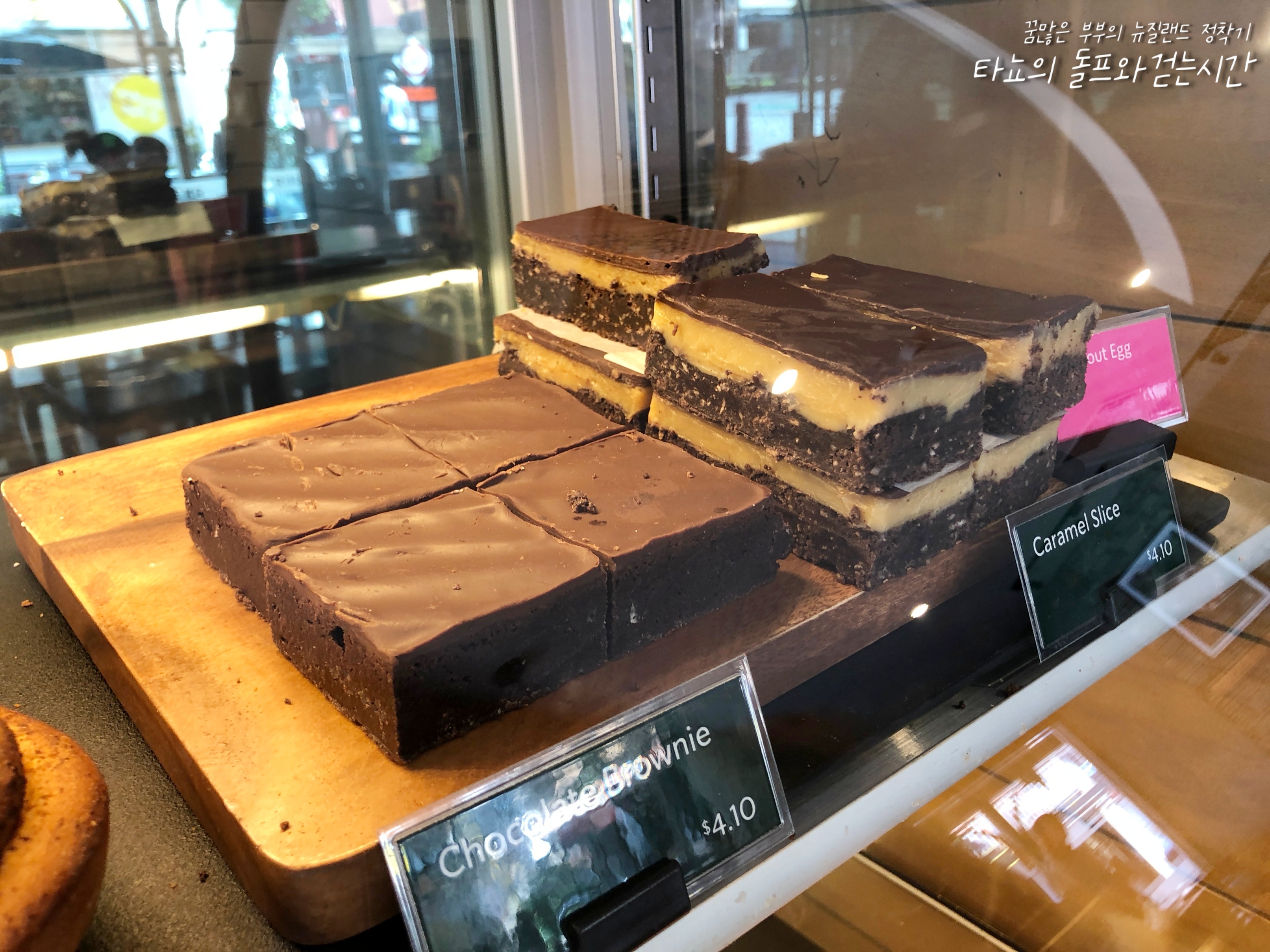 초콜릿 브라우니와 카라멜 슬라이스입니다. 뉴질랜드 어느 카페에서나 볼 수 있는 가장 일반적인 캐비닛 스윗류라고 볼 수 있죠. 보통 롤리케이크나 오트바, 초콜릿 슬라이스도 흔하게 있는 편인데 스타벅스에서는 찾을 수 없었어요.