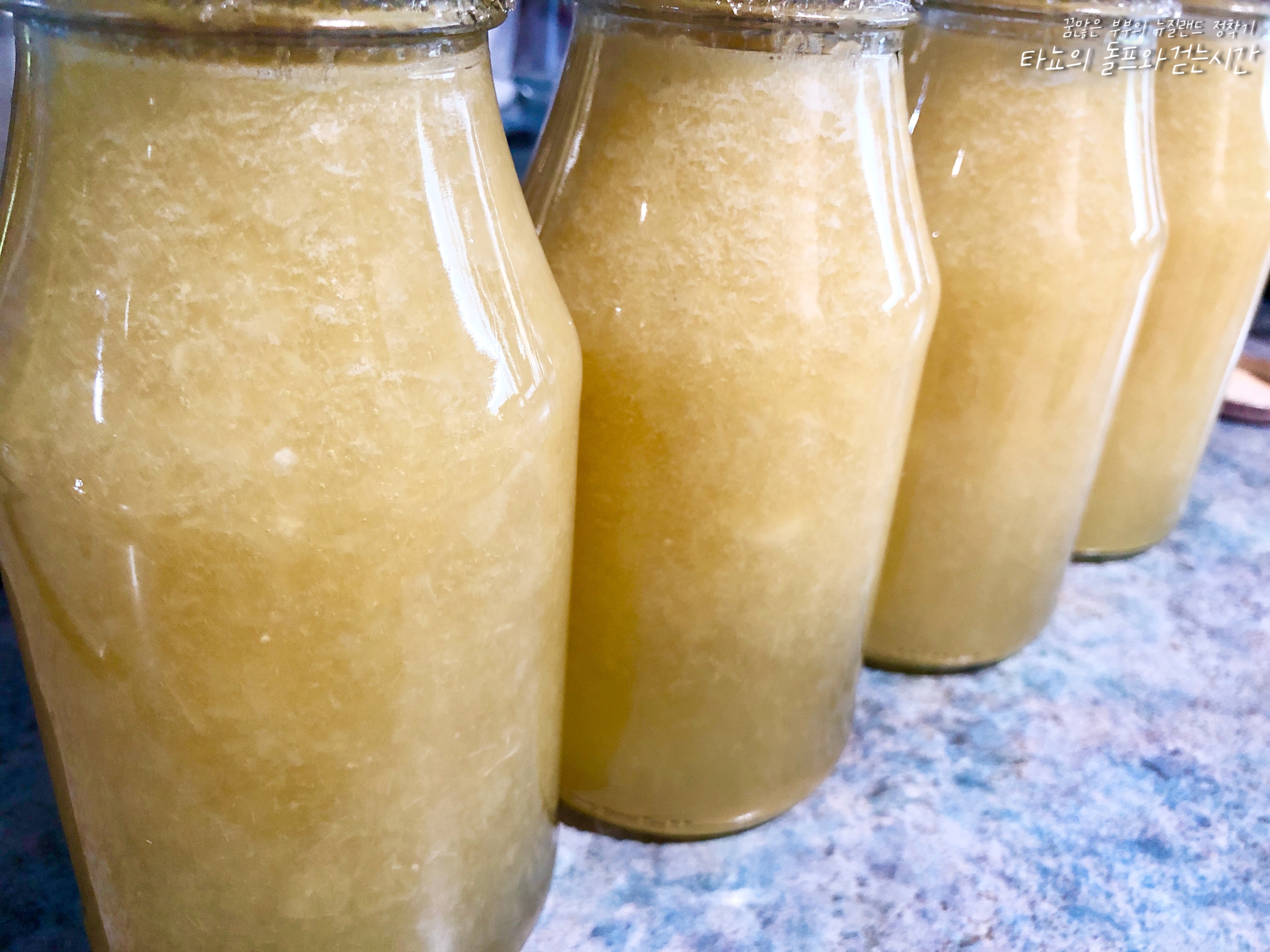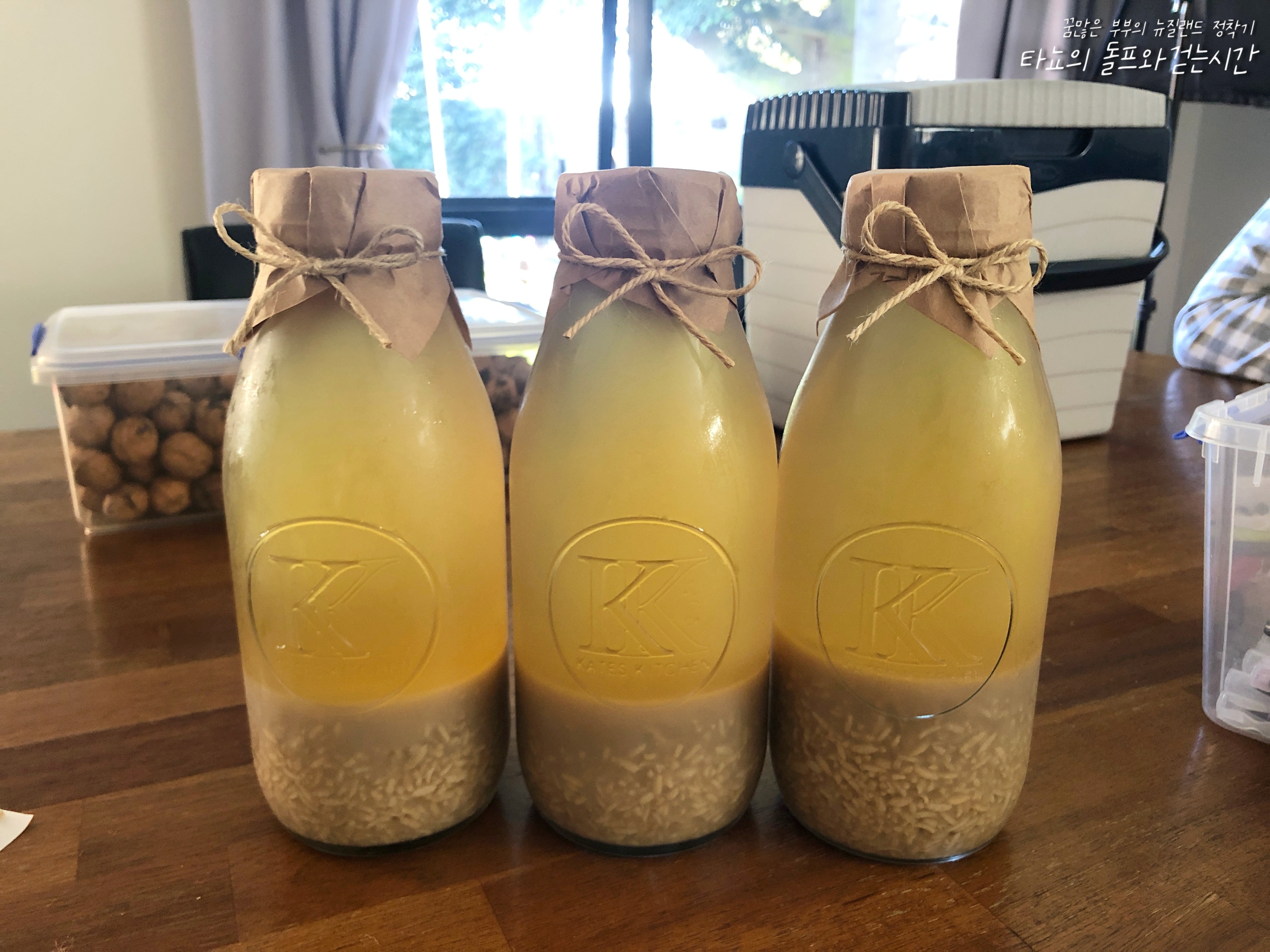 엄마에게 배운대로 엿기름 팍팍 문질러서 식혜를 끓였습니다. 밥알이 미끄덩거리면 덜 삭은 거라는 말을 꼭 기억하면서 오랜 시간 삭혀서 만들었어요. 1.5리터 유리병에 담아 총 3병을 준비했지요. 많은 양의 식혜가 필요할 때는 마지막에 끓일 때 물을 더 부어서 희석시켜준 다음 설탕 넣어서 당도를 맞추면 됩니다.