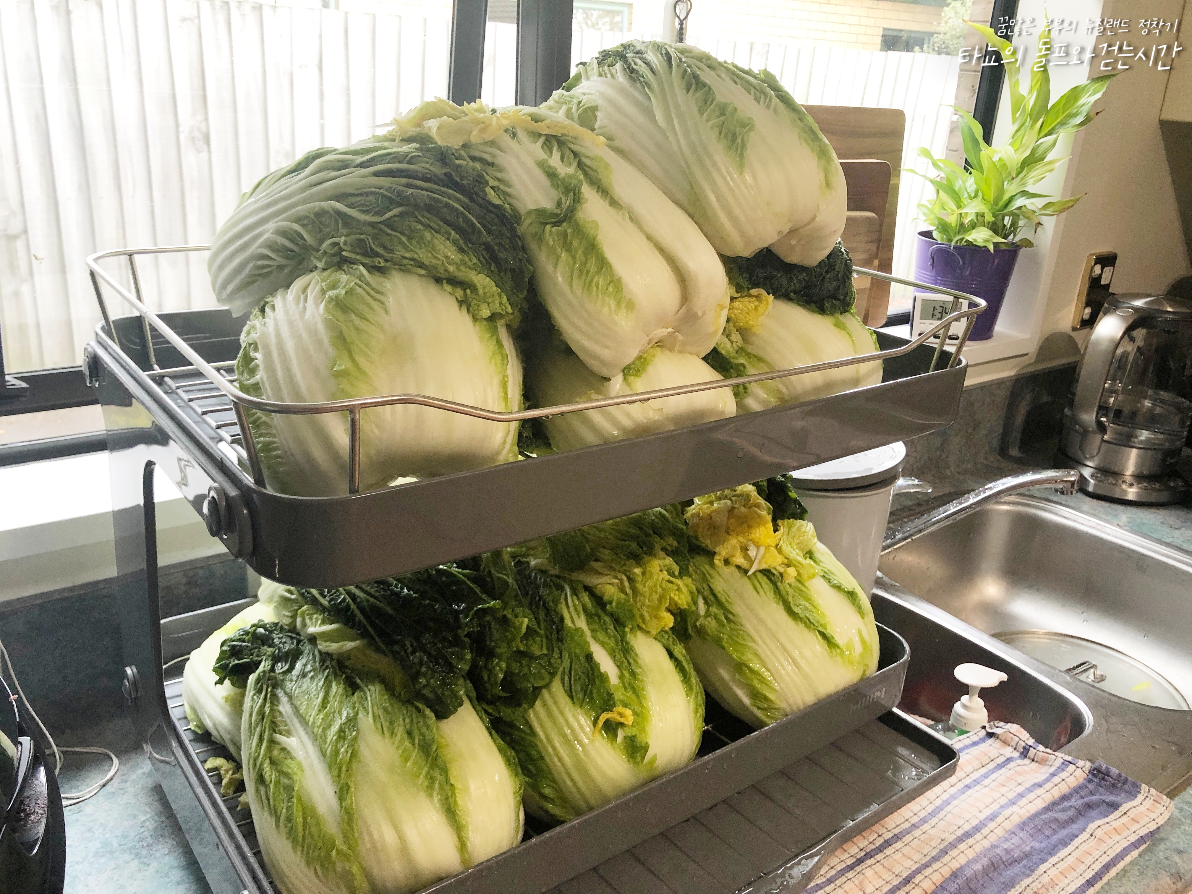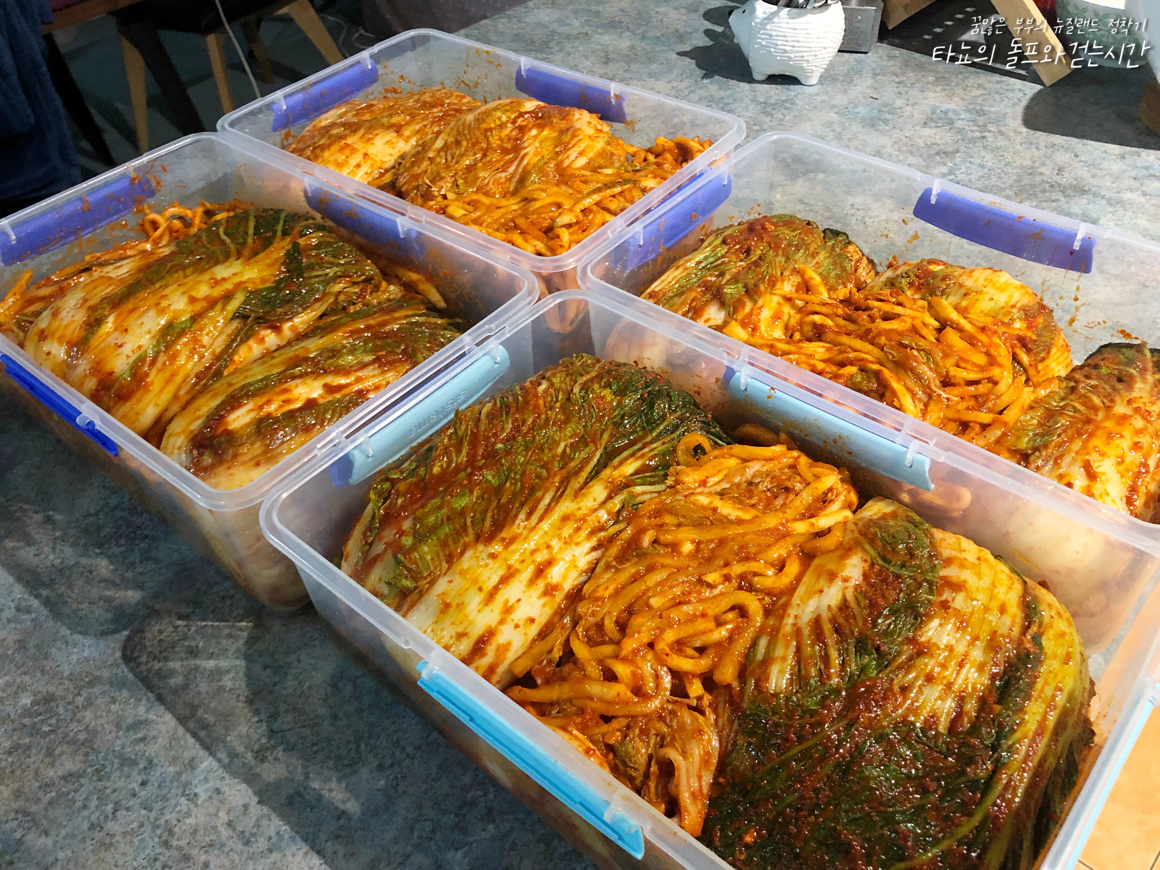배추 10포기 구입해서 김치도 담았습니다. 마침 김장 시즌이라 배추가 크고 속이 꽉차서 좋았어요. 하루 절인 배추를 건져서 양념을 더했죠.
