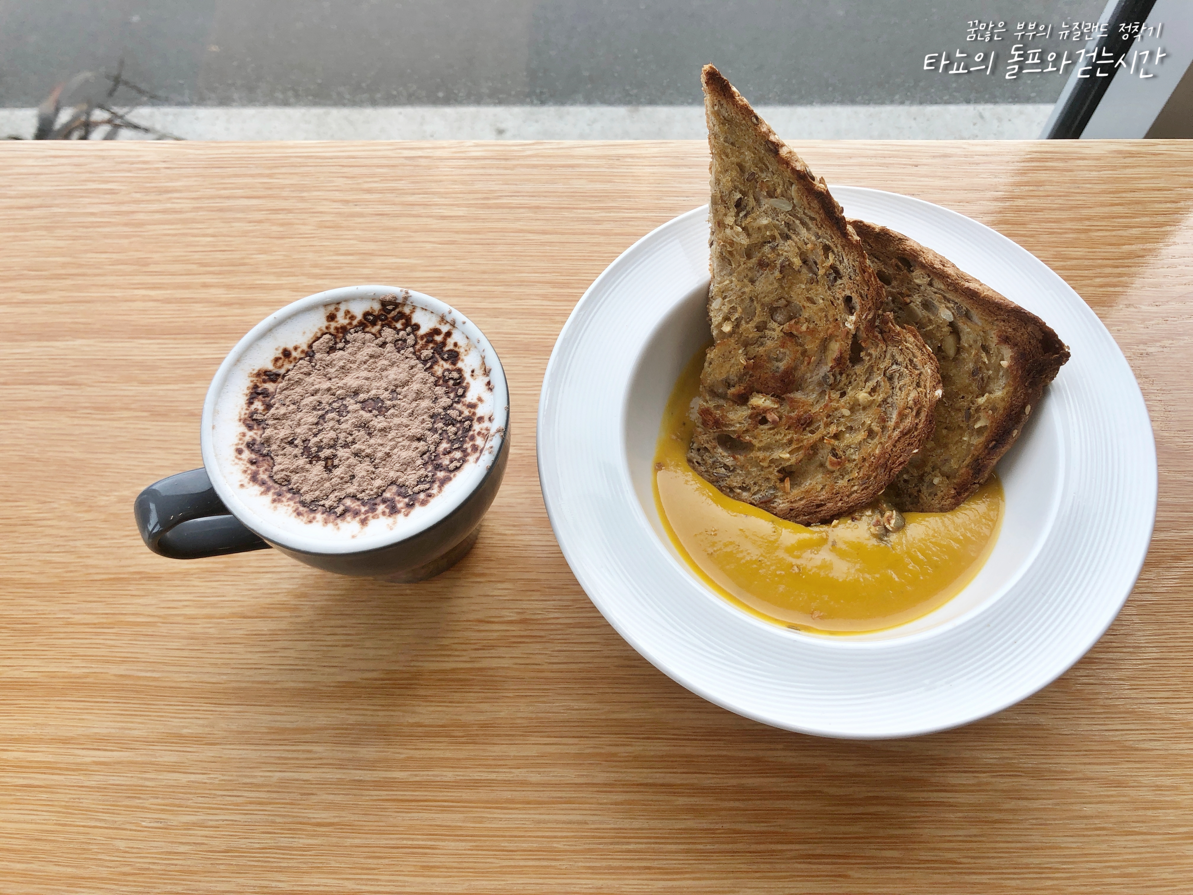 호박 본연의 맛과 양파, 마늘, 크림, 견과류 등이 들어가 더 풍부한 맛을 지니고 있습니다. 하지만 한국 호박죽 먹듯이 그냥 먹기에는 조금 강할 수 있고요. 식빵 토스트나 치아바타 빵 토스트 한 것을 곁들여서 함께 먹으면 참 맛있고 좋습니다. 개인적으로 치아바타 완전 추천해요.