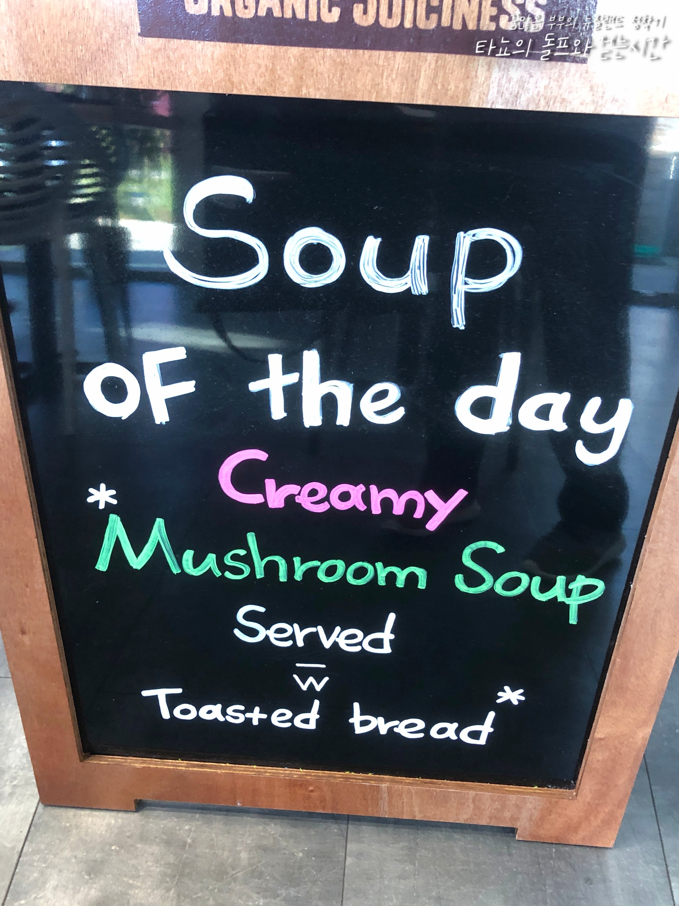 카페에서는 거의 매주마다 새로운 수프를 선보이고 있어요. 한번 만들 때 10인분 정도를 만드는 것 같은데요. 일주일 안에 보통 거의 다 팔리기 때문에 주말에는 또 새로운 수프를 준비해서 그다음 주에 판매하죠. 저는 개인적으로 크리미 머쉬룸 수프가 너무 맛있었어요.