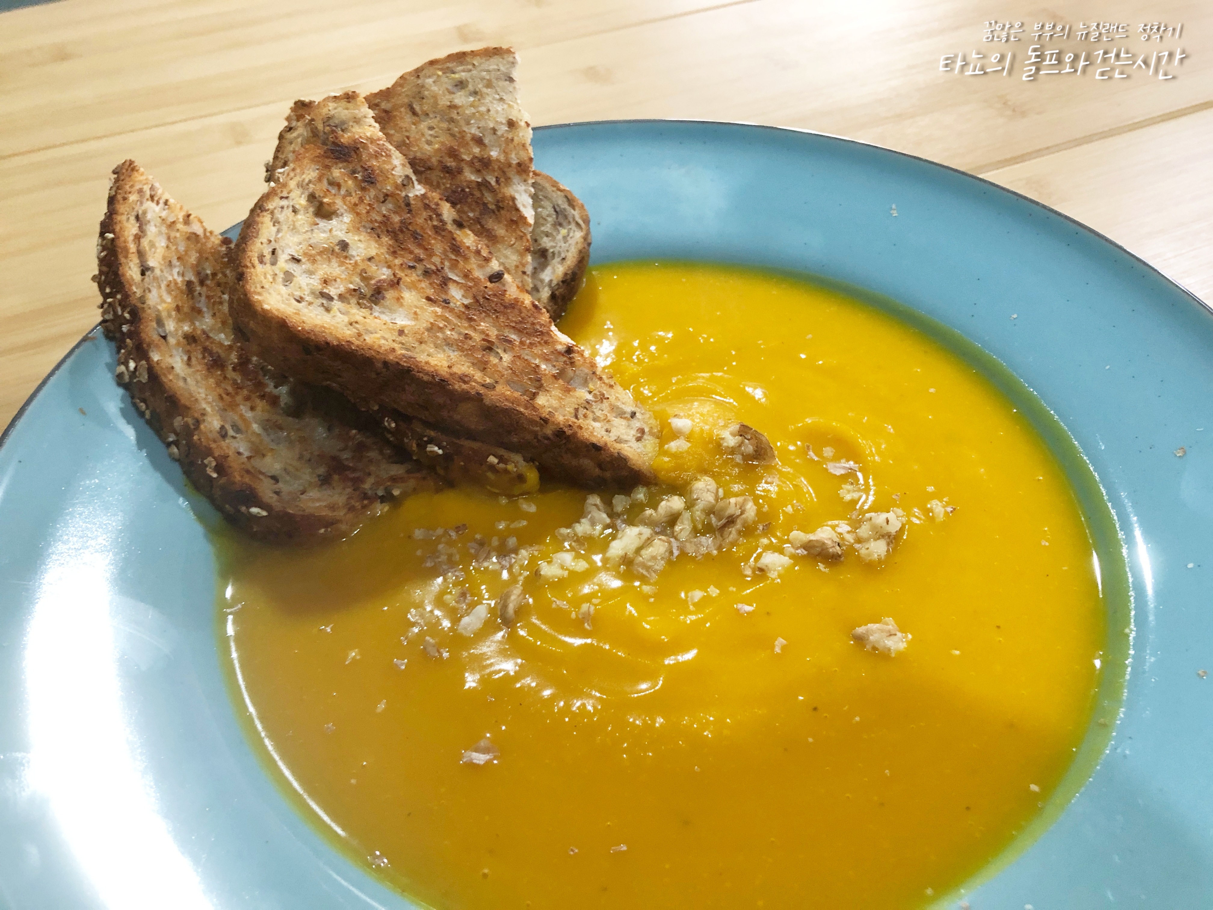 카페에서 먹었던 호박죽이 너무 맛있었던 나머지 집에 있던 호박을 잘라 호박 수프를 만들었어요. 한국식 호박죽만 먹어봤던 신랑은 처음에 호박 수프만 먹고는 '윽, 내 입맛에 안맞아, 맛이 너무 강하고 이상해'라고 말했는데요. 나중에 토스트를 구워서 제대로 준비해주니 '와, 이렇게 먹으니까 맛있네?'라고 하더군요. 빵을 곁들여 먹는 수프 너무 좋은데, 빵 너무 많이 먹으면 속에 안 좋을까 봐 그게 조금 걱정되긴 해요.