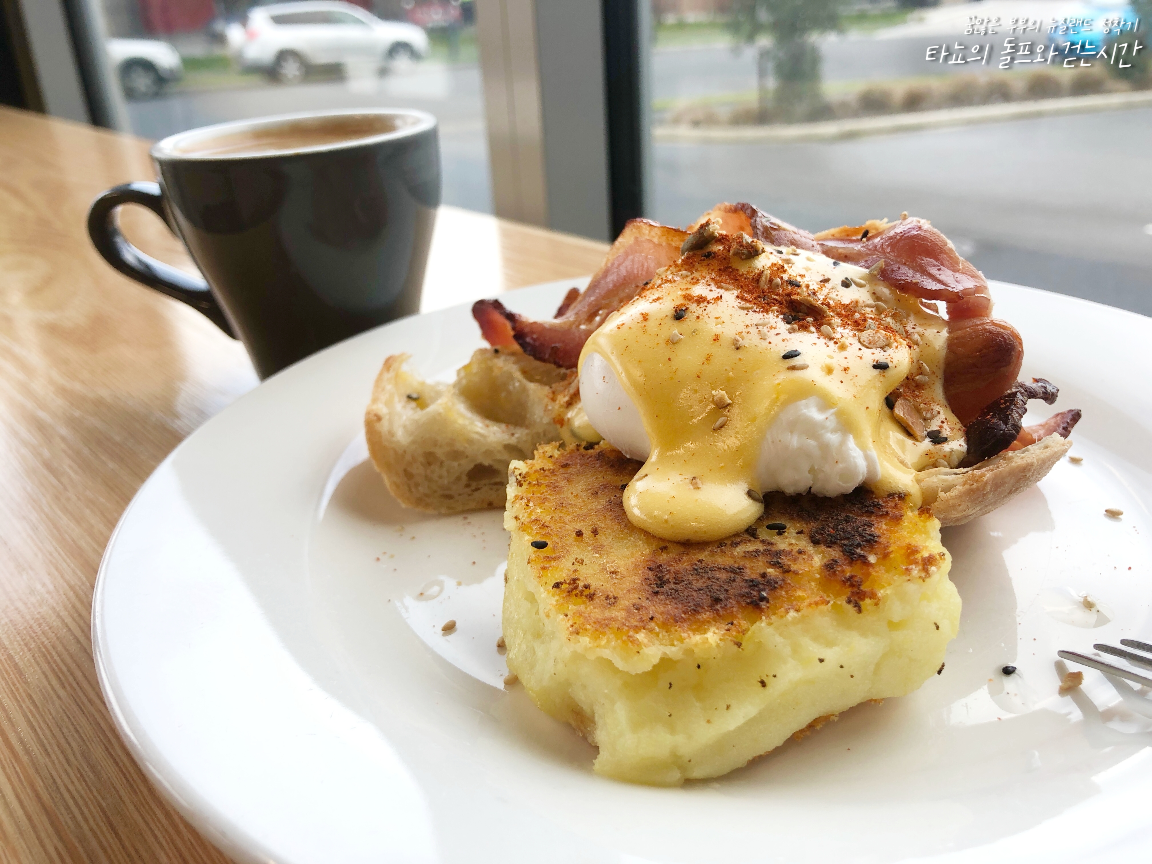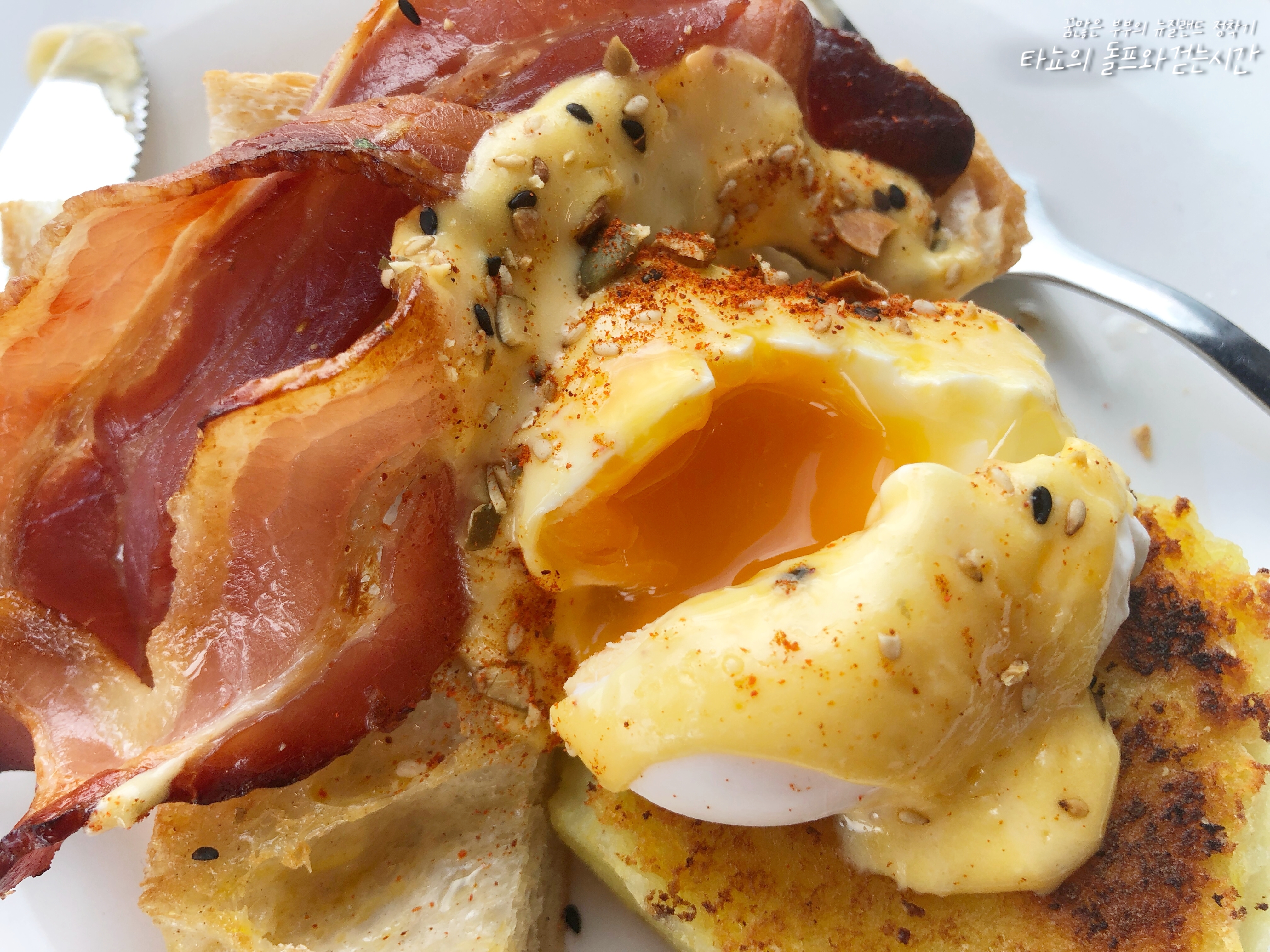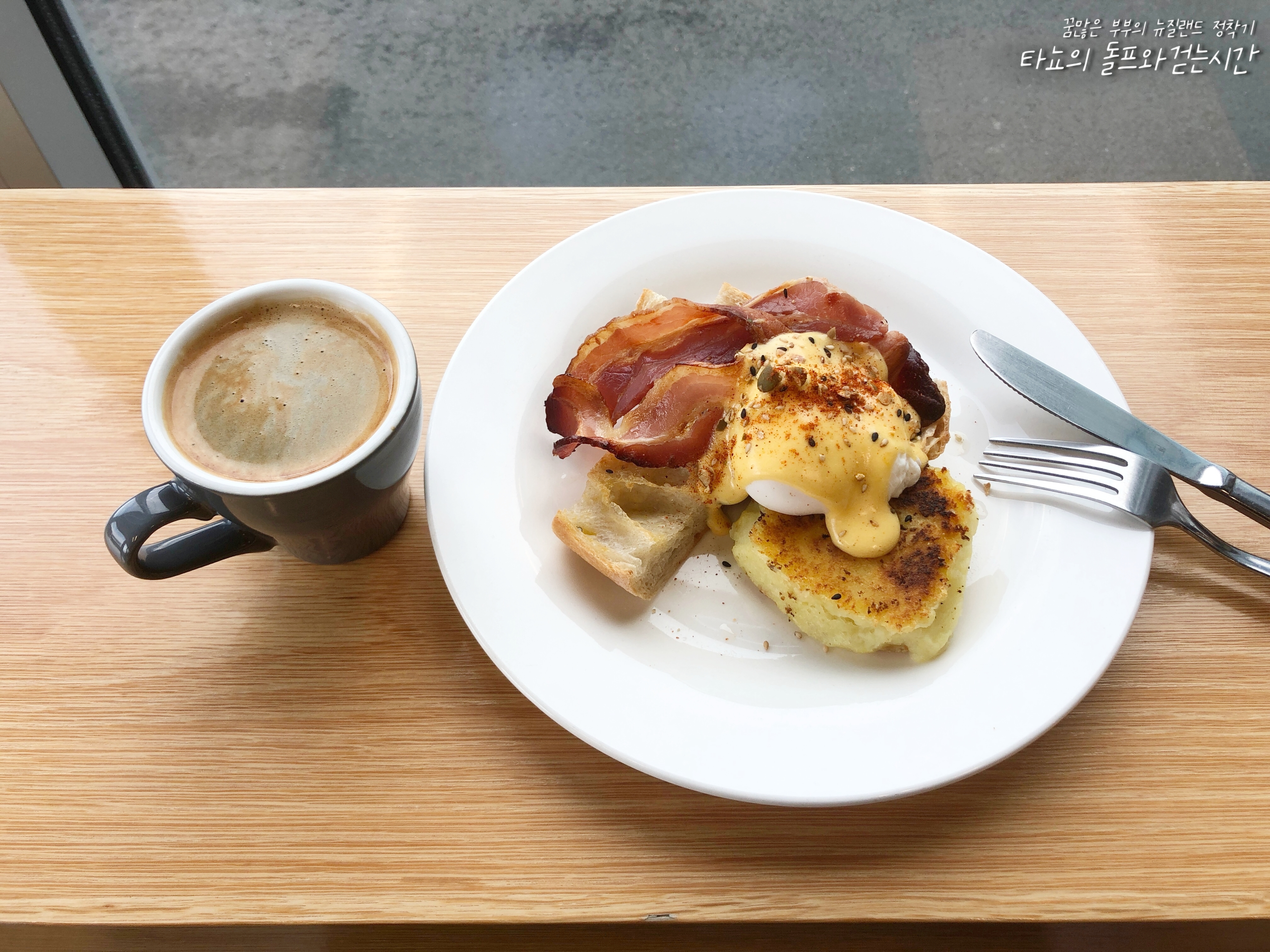 사장님이 만들어주신 에그 베네딕트 하프 사이즈와 아메리카노입니다. 브레이크 10분 만에 먹으려니 바쁘게 먹긴 했지만, 그래도 꿀맛!