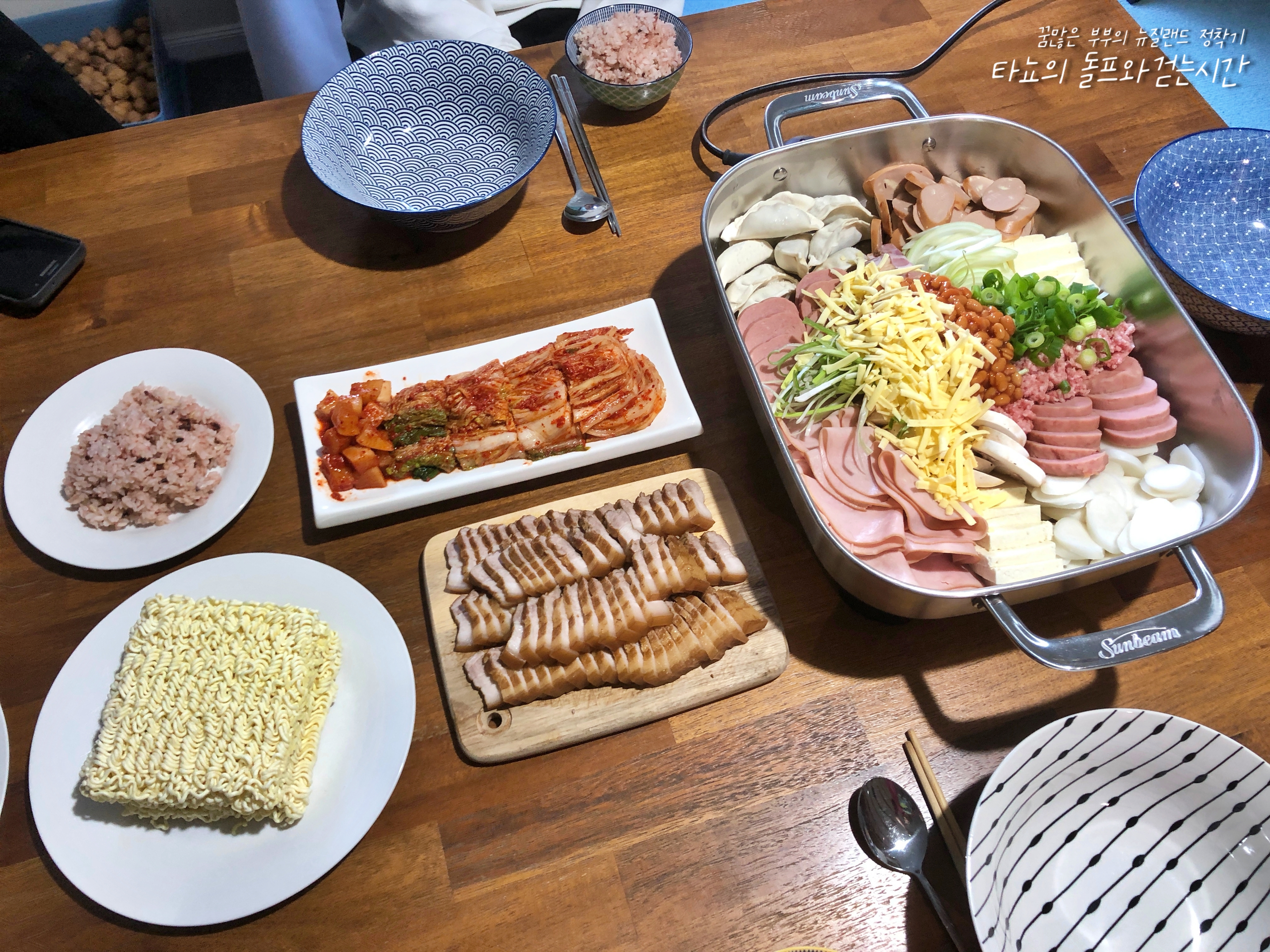 재료 : 베이크드빈 130g, 할루미 치즈 150g, 스팸 200g, 떡 1줌, 치즈 소시지 3개, 슬라이스 햄 10장, 만두 10개, 돼지고기 민스 1 국자, 자른 김치 1 국자, 양파 1개, 대파 2대, 체다치즈 2줌, 면사리 1개, 사골육수