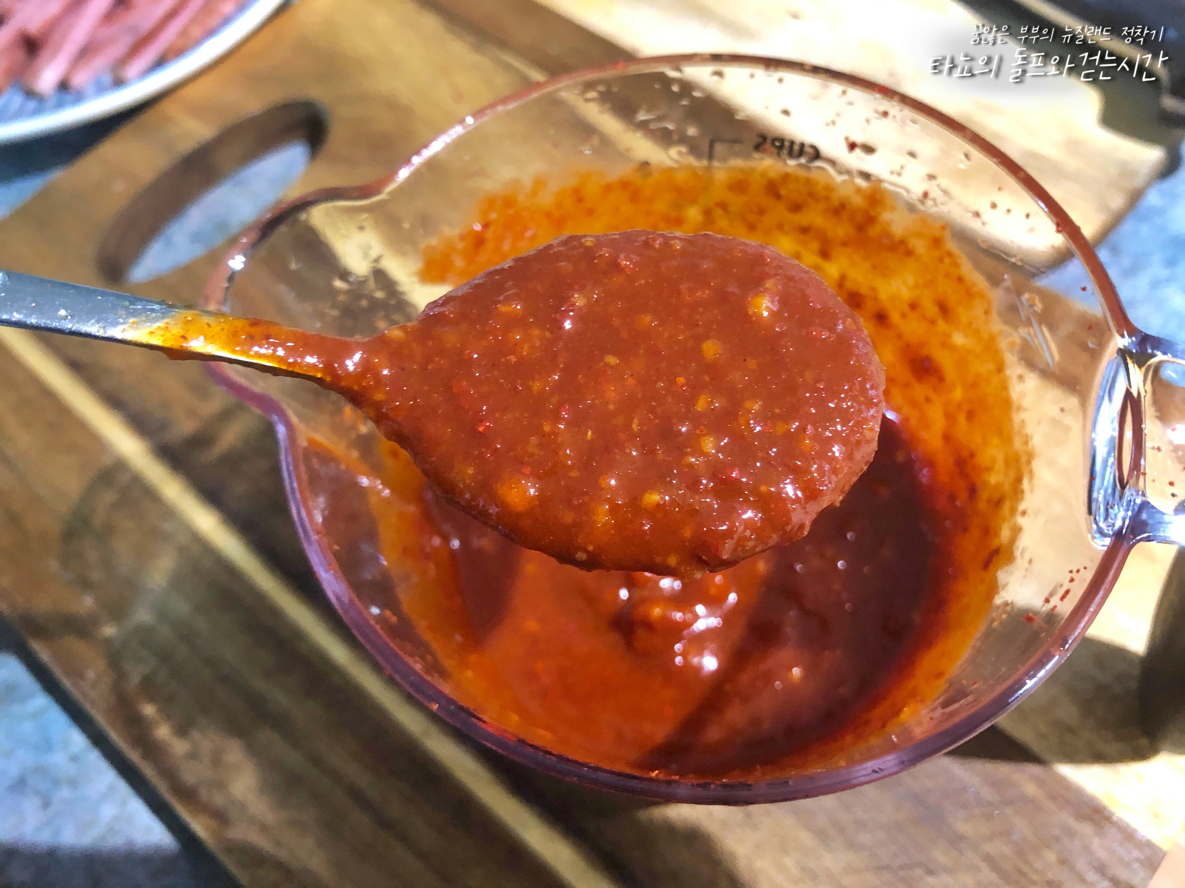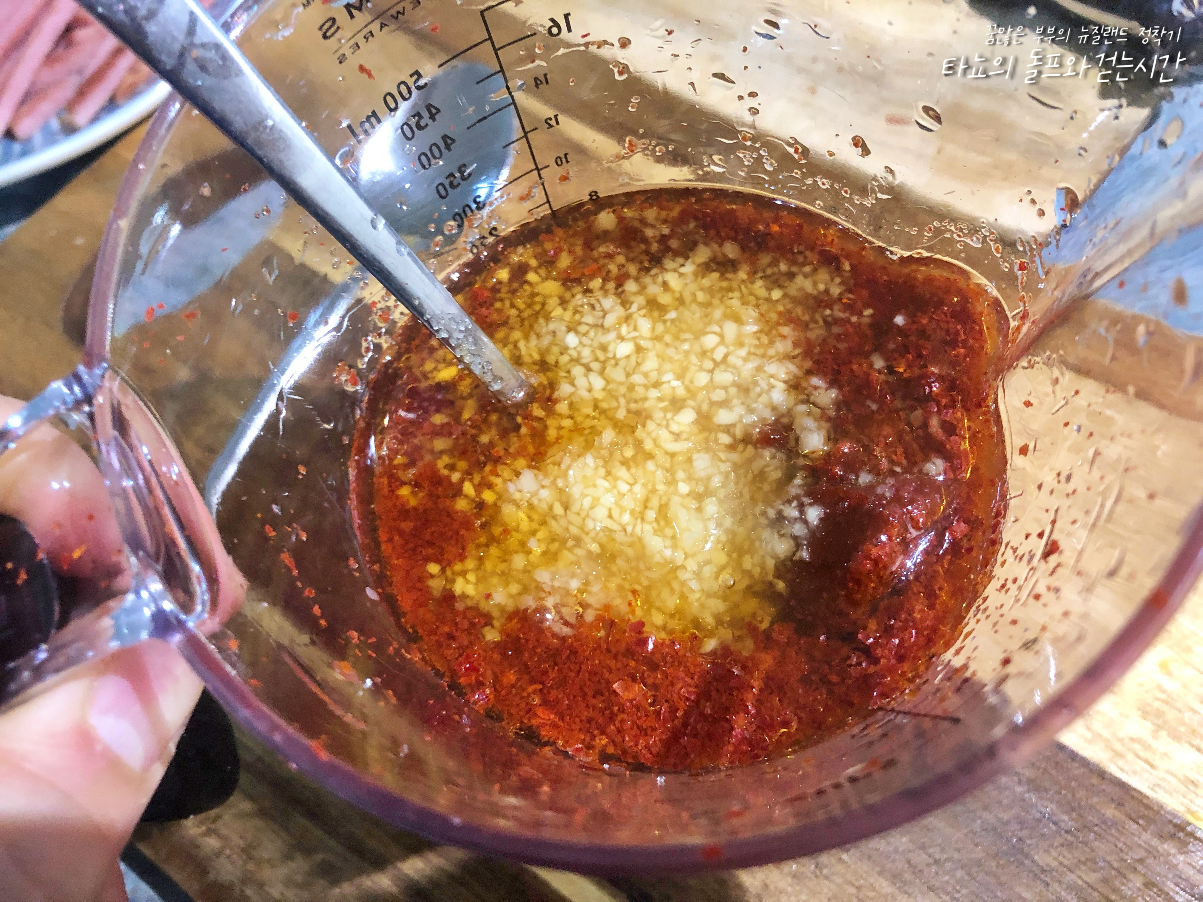 재료(2인) : 고추장 4큰술, 고춧가루 2큰술, 식초 6큰술, 설탕 2큰술, 올리고당 2큰술, 간장 1큰술, 다진 마늘 1큰술, 참기름 2큰술