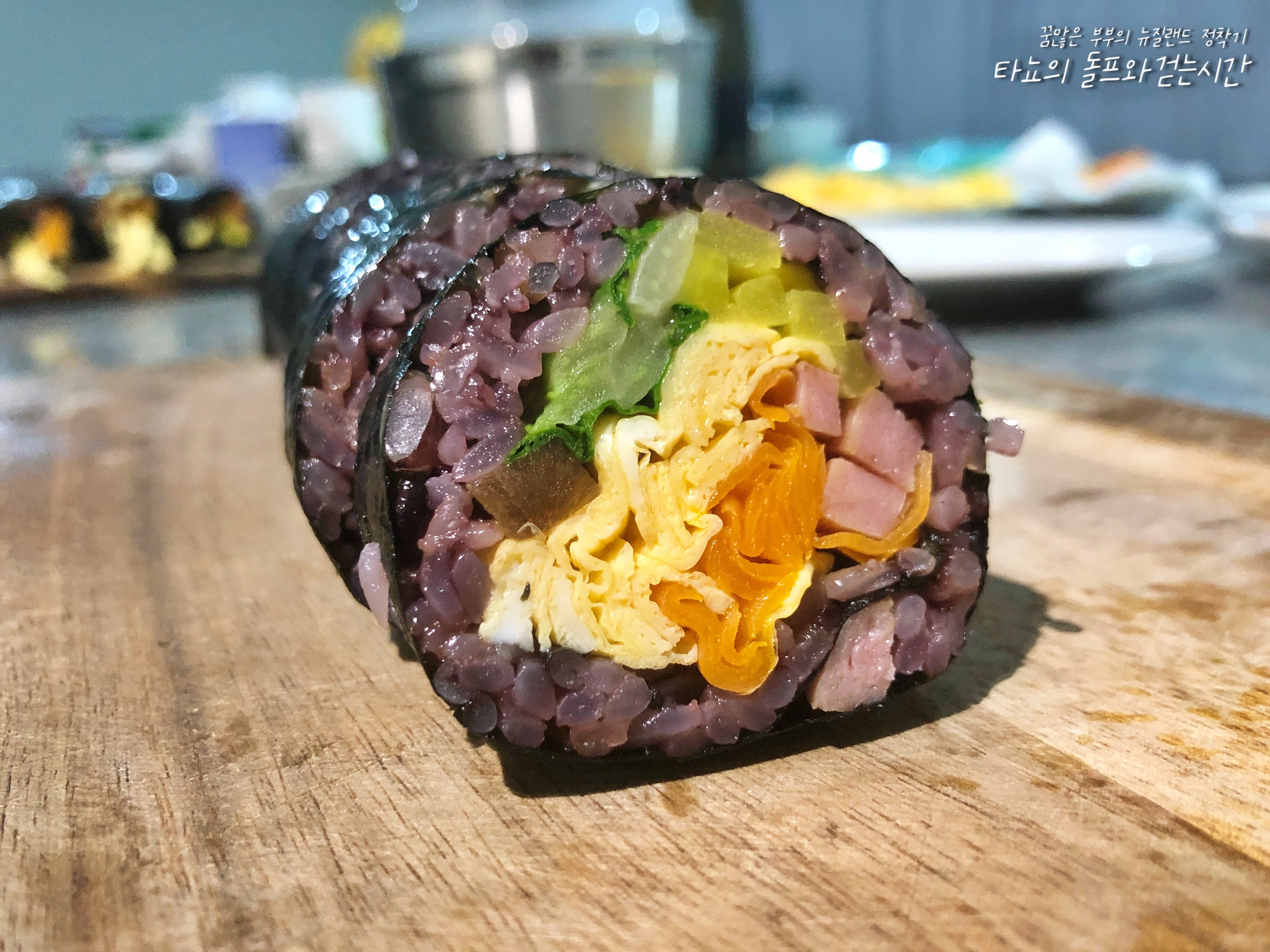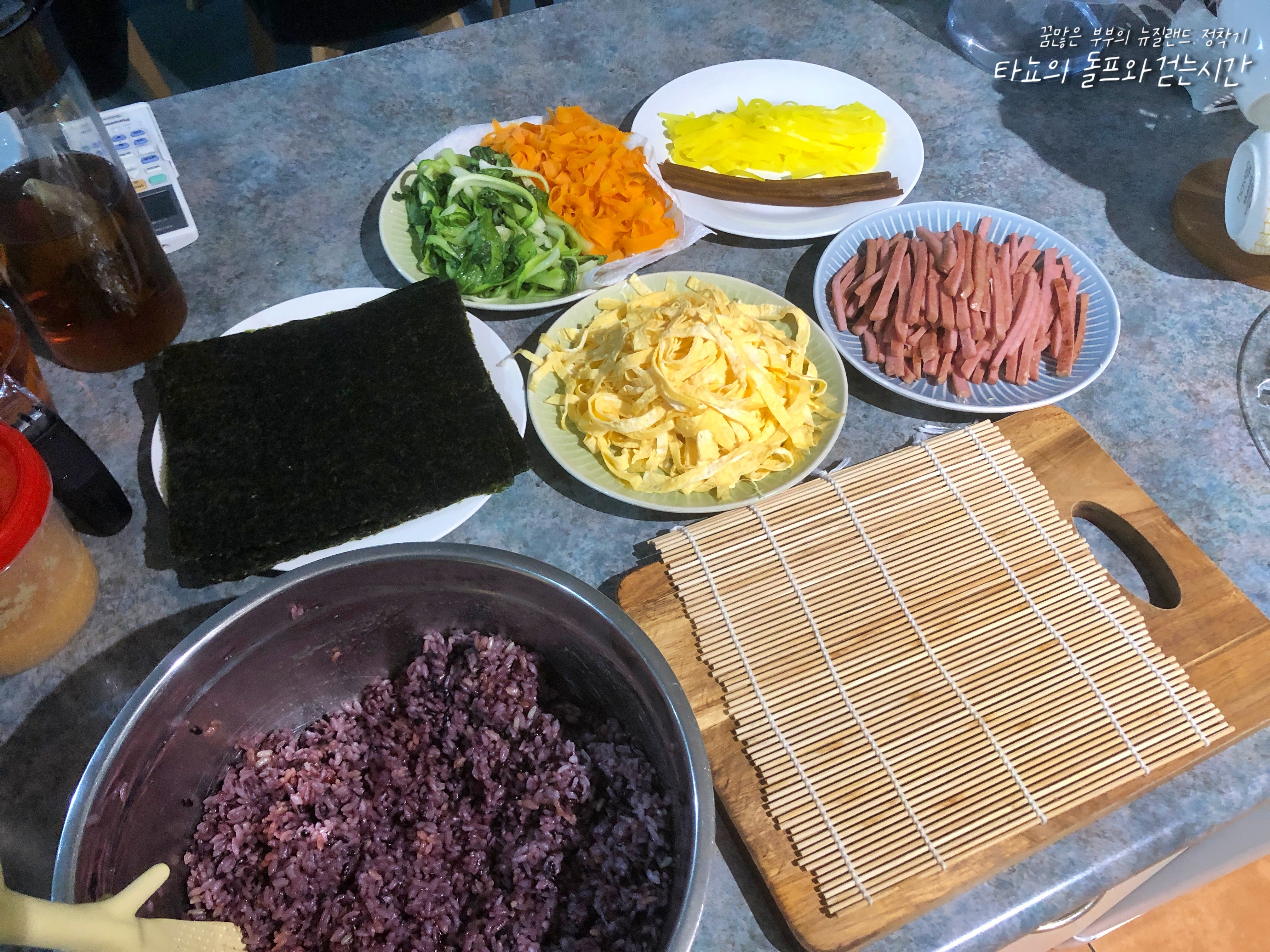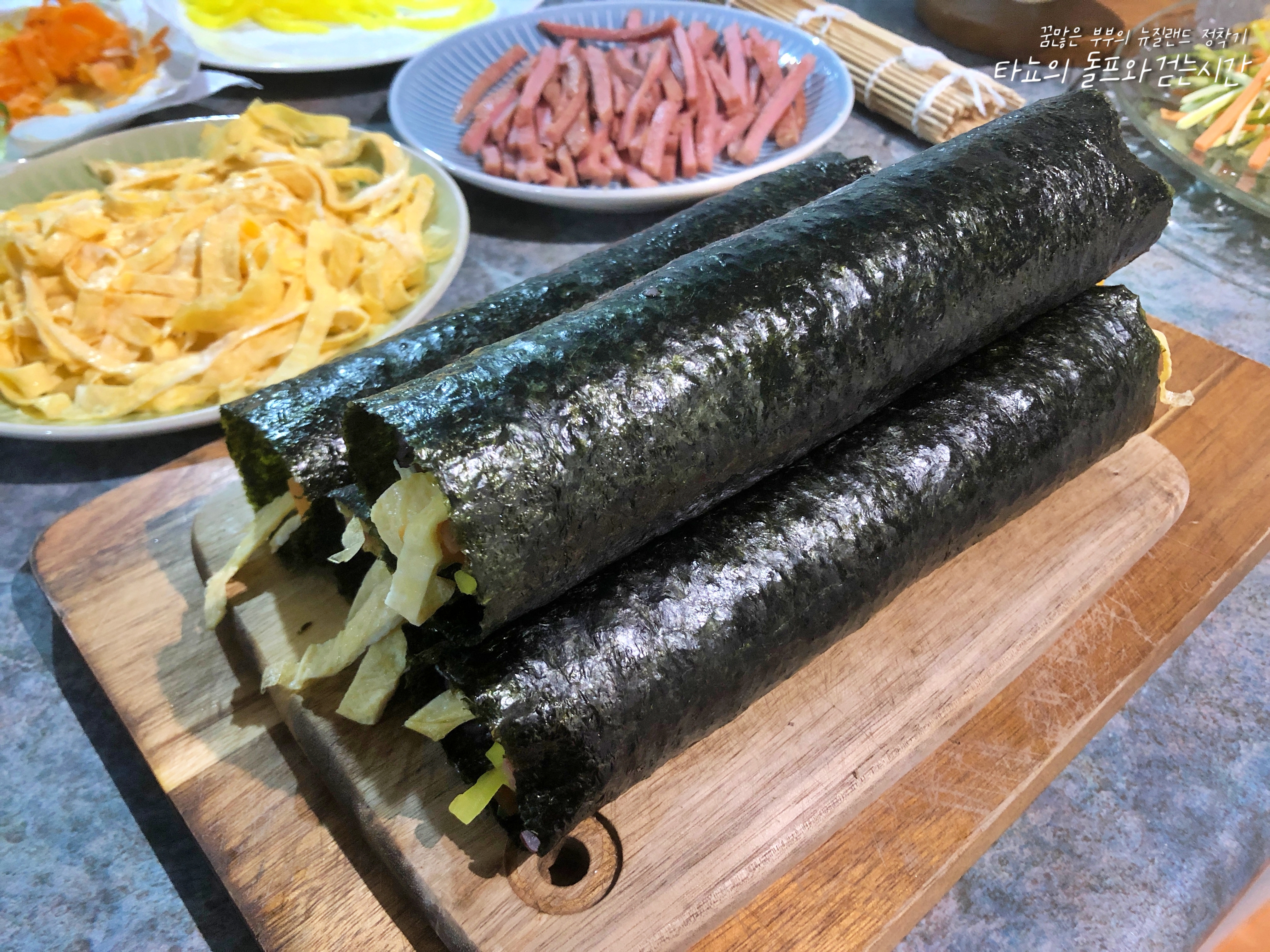돌돌 말아서 이렇게 쌓아두면 자연스럽게 끝부분의 김이 착착 붙습니다. 처음에 바로 붙지 않는다고 걱정할 필요 없습니다. 오늘 저녁식사에 먹을 김밥은 딱 3줄이지만, 이왕 싸는 거 넉넉하게 싸서 내일 신랑 점심 2줄, 플랫 메이트 점심 2줄, 그리고 카페 사장님 드릴 김밥 2줄도 함께 준비했습니다. 총 9줄을 준비했네요. 저는 꼬다리로 충분....