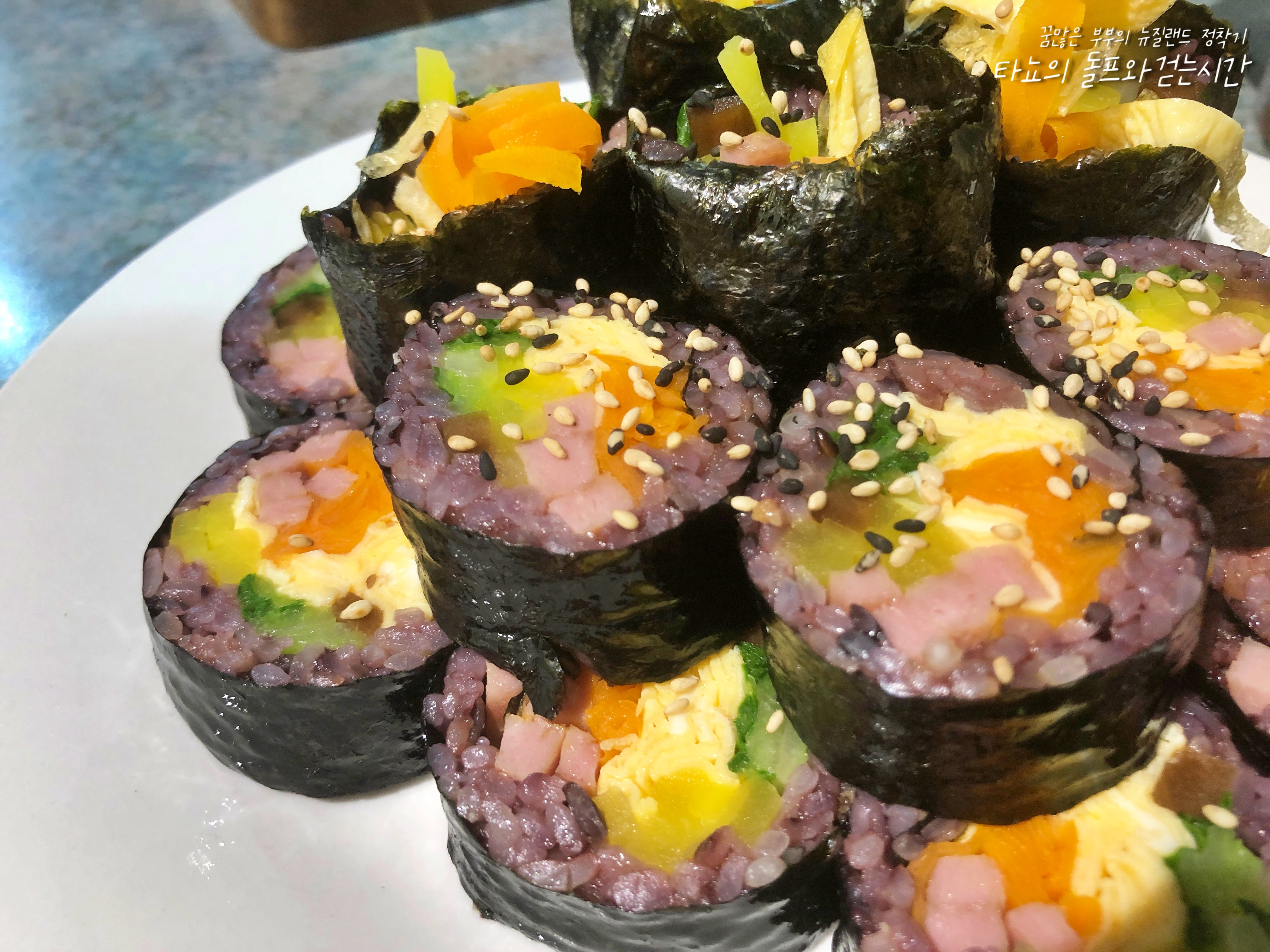 맛있는 김밥이 완성되었어요. 단단하게 잘 싸져서 자르기 좋았습니다. 색이 참 곱네요.