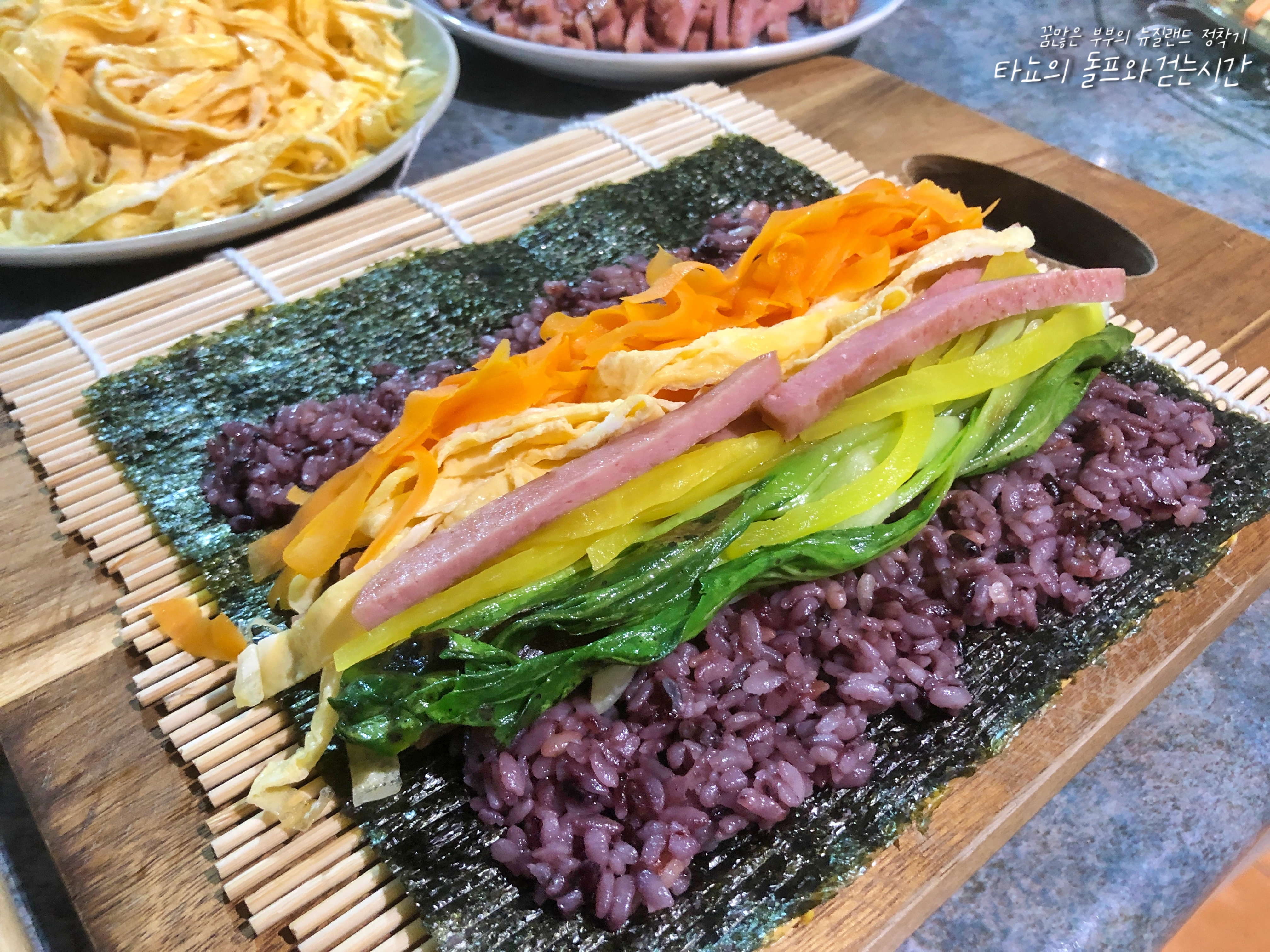 김 위에 고슬고슬하게 준비한 조미 밥(소금, 참기름, 깨)을 올려서 살살 펴주세요. 끝부분은 조금 남겨 둬야 말기 편합니다. 중앙에 청경채, 당근, 달걀, 햄, 단무지, 우엉지 듬뿍 올렸습니다.