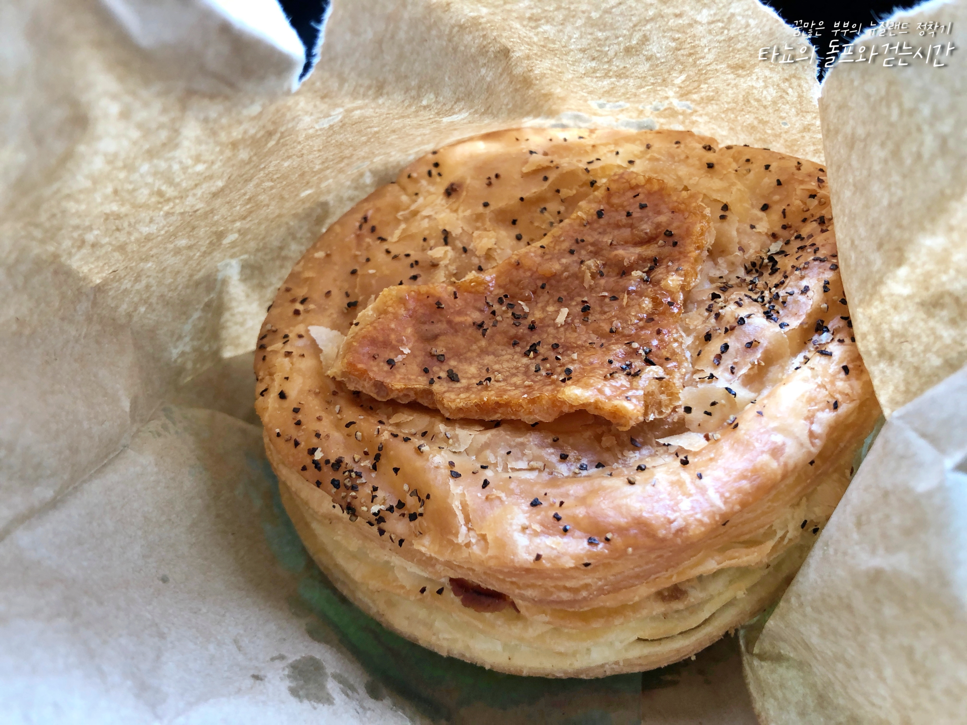이건 신랑의 최애 파이인 '포크밸리&애플소스($6)'입니다. 말 그대로 삼겹살과 사과잼의 조화인데요. 파이 상단에는 바삭하게 튀긴 돼지껍질이 올려져 있습니다. 각 파이들은 모두 다른 상단의 토핑이 붙어 있는데요. 이 토핑으로 파이 종류를 구분합니다. 5년 전 처음 이곳을 방문했을 때 저 또한 신랑의 최애 파이를 맛봤었지만, 제 입맛에는 정말 맞지 않는 맛이었어요. 하지만 신랑 입맛에는 찰떡이라 매번 신랑은 이 파이를 먹습니다 ^^;; 달콤한 삼겹살이라뇨...