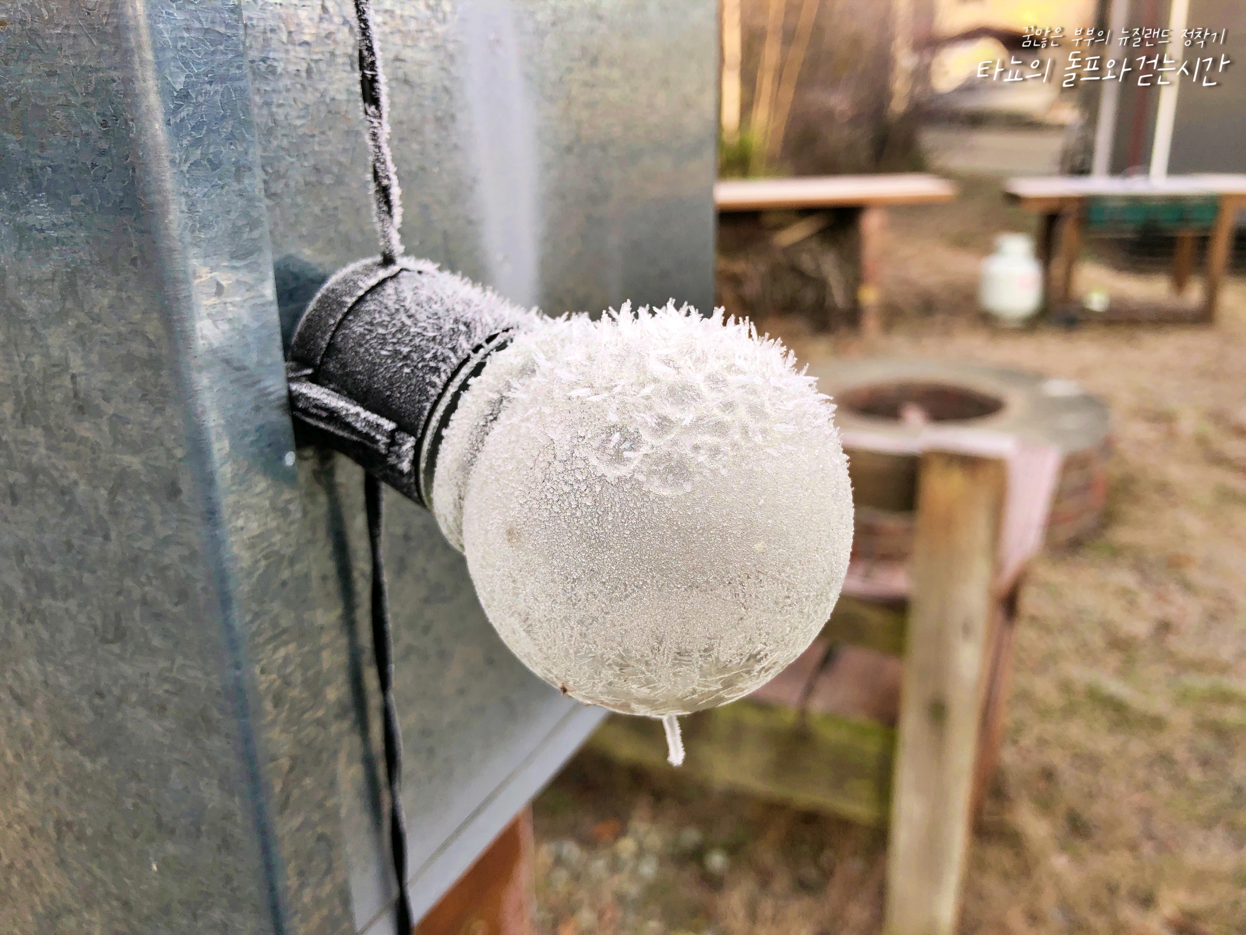 야외 테이블 쪽에 장식된 전구가 얼어붙을 만큼 추운 날씨였습니다. 유리 전구가 터지지 않는 게 신기했답니다.