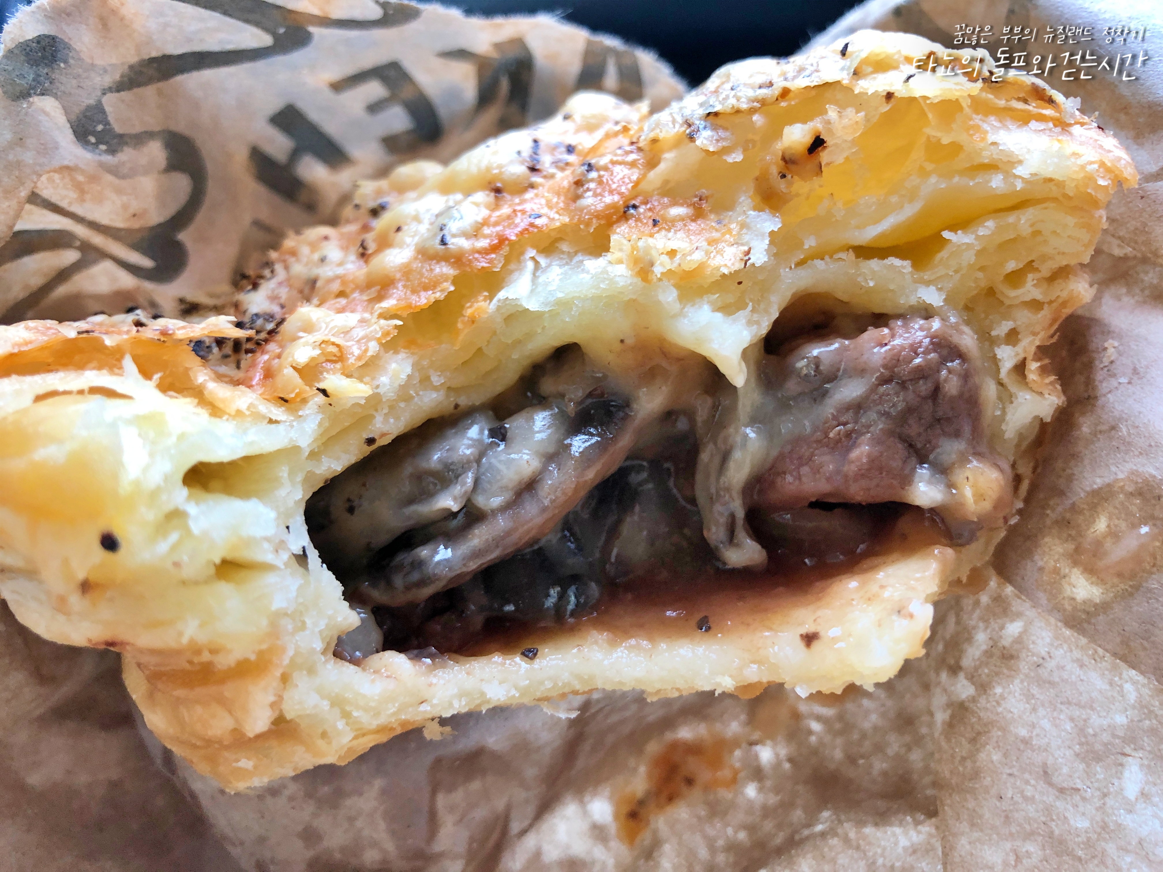 이 파이는 처음 보는 파이였는데요. '울티메이트 스테이크($7)'입니다. 각자 하나의 파이를 골랐지만 약간의 아쉬움과 처음 보는 신 메뉴에 대한 약간의 궁금증이 더해져 충동적으로 구매했습니다. 속은 안심으로 꽉 찼더라고요. 치즈와 후추를 듬뿍 넣어서 맛은 정말 좋았는데요. 진짜 찹스테이크를 먹는 기분이었어요. 하지만 배가 너무 불렀습니다. 그래서 약간 후회했어요 ^^;; 욕심부리지 말걸...