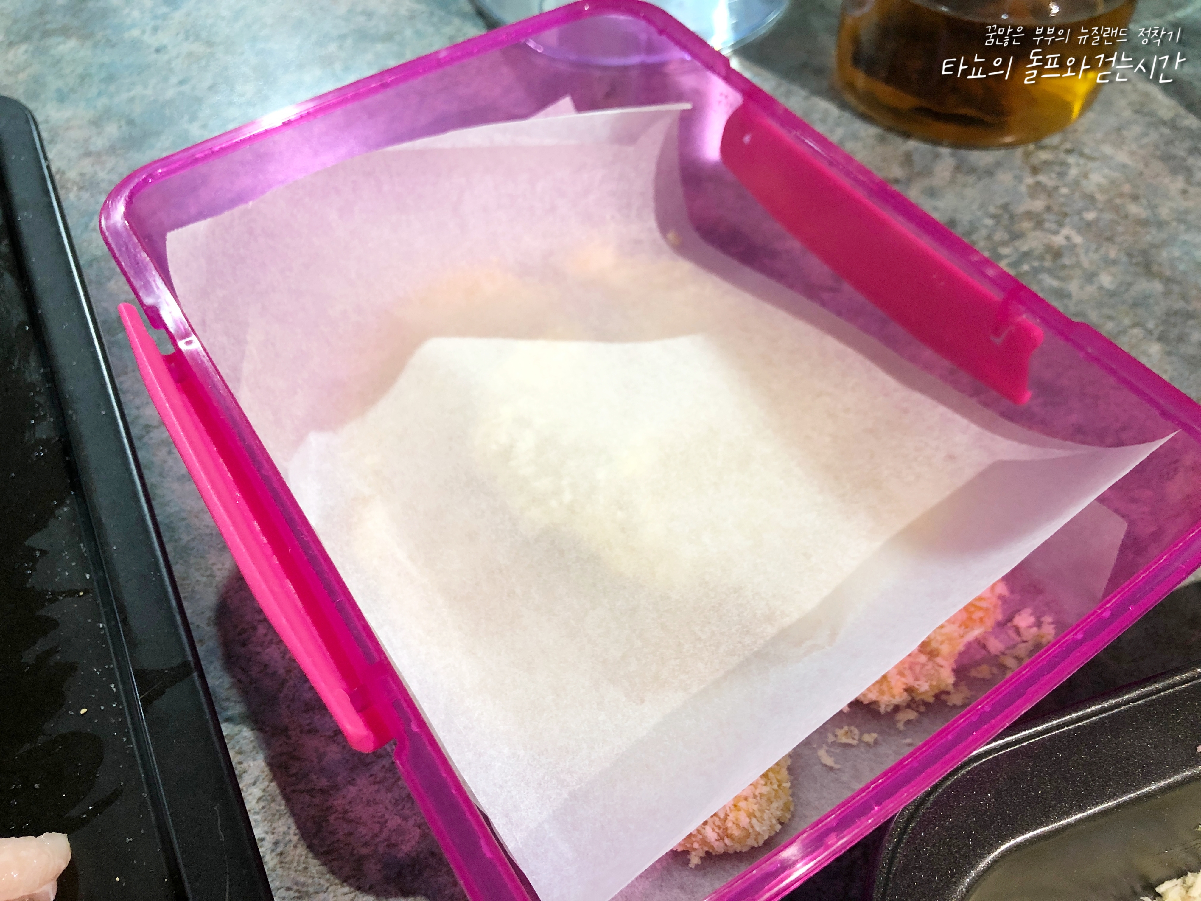 저는 서로 들러붙지 않도록 한 층 깔고 종이 포일 덮고 또 한 층 깔아주는 형태로 채웠어요. 예전에는 잘 모르고 그냥 막 넣어 냉동했는데 나중에 꺼내보니 서로 들러붙어서 떼는데 고생했거든요. 치킨 가스나 돈가스, 떡갈비 등은 만들어서 보관할 때 이렇게 사이사이에 종이 포일을 끼워주는 게 나중에 편하더라고요. 600g 1팩을 모두 작업하니 용기에 가득 딱 1통이 나왔네요.