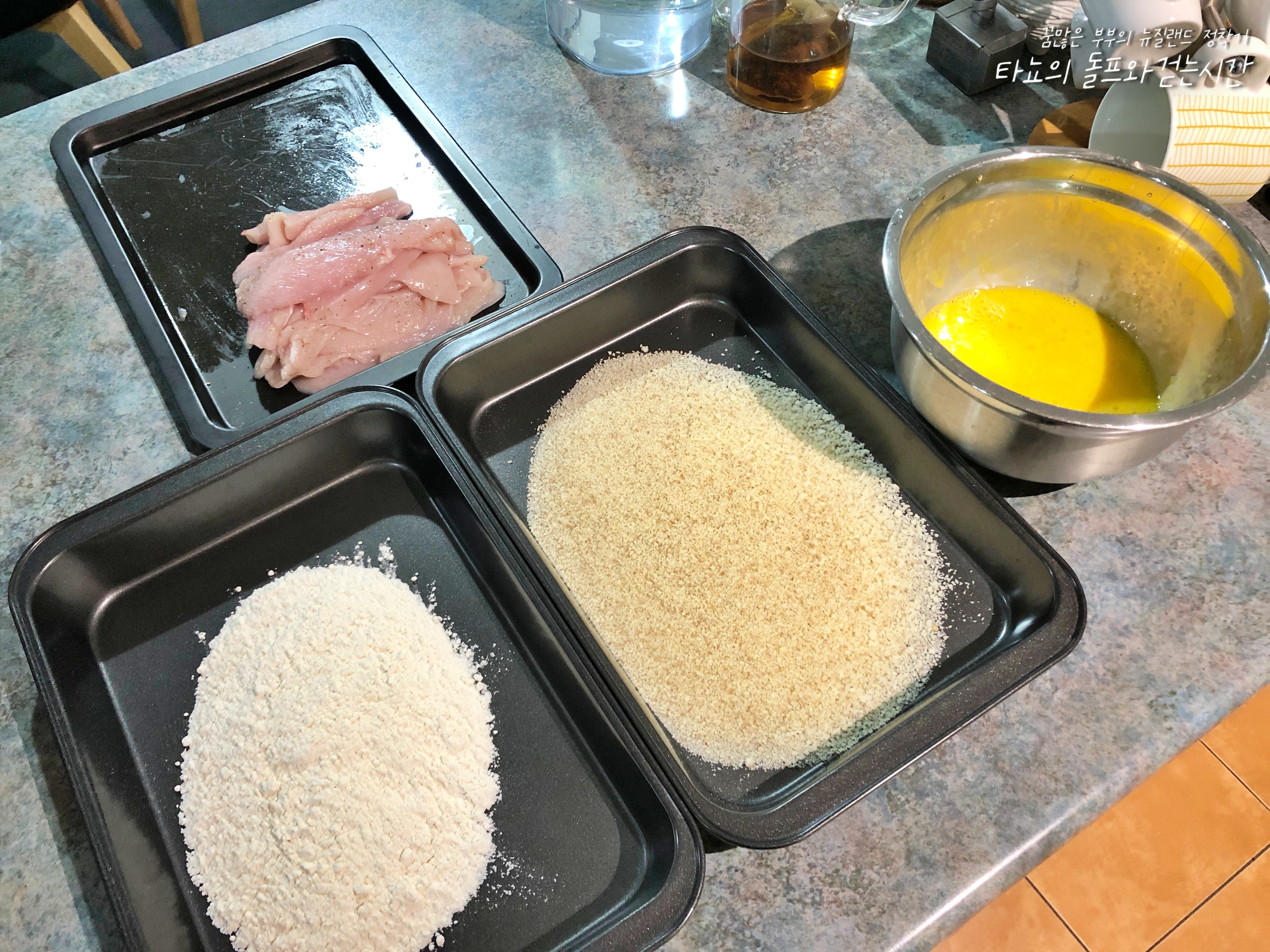 치킨가스, 돈가스 이제 사지 말고 만들어 드셔 보세요. 사실 솔직하게 말하면 한국에서는 냉장, 냉동 돈가스가 너무 잘 나오니까 집에서 해먹을 일이 더 없었던 것 같긴 합니다. 하지만 요즘에는 내 가족의 건강을 위해서 직접 만드는 분들도 많으신 것 같아요. 저는 신랑에게 더 좋은 음식을 먹게 해주고 싶은 마음도 있었지만, 무엇보다 생활비를 조금 더 아껴보자는 마음이 컸던 것 같습니다.