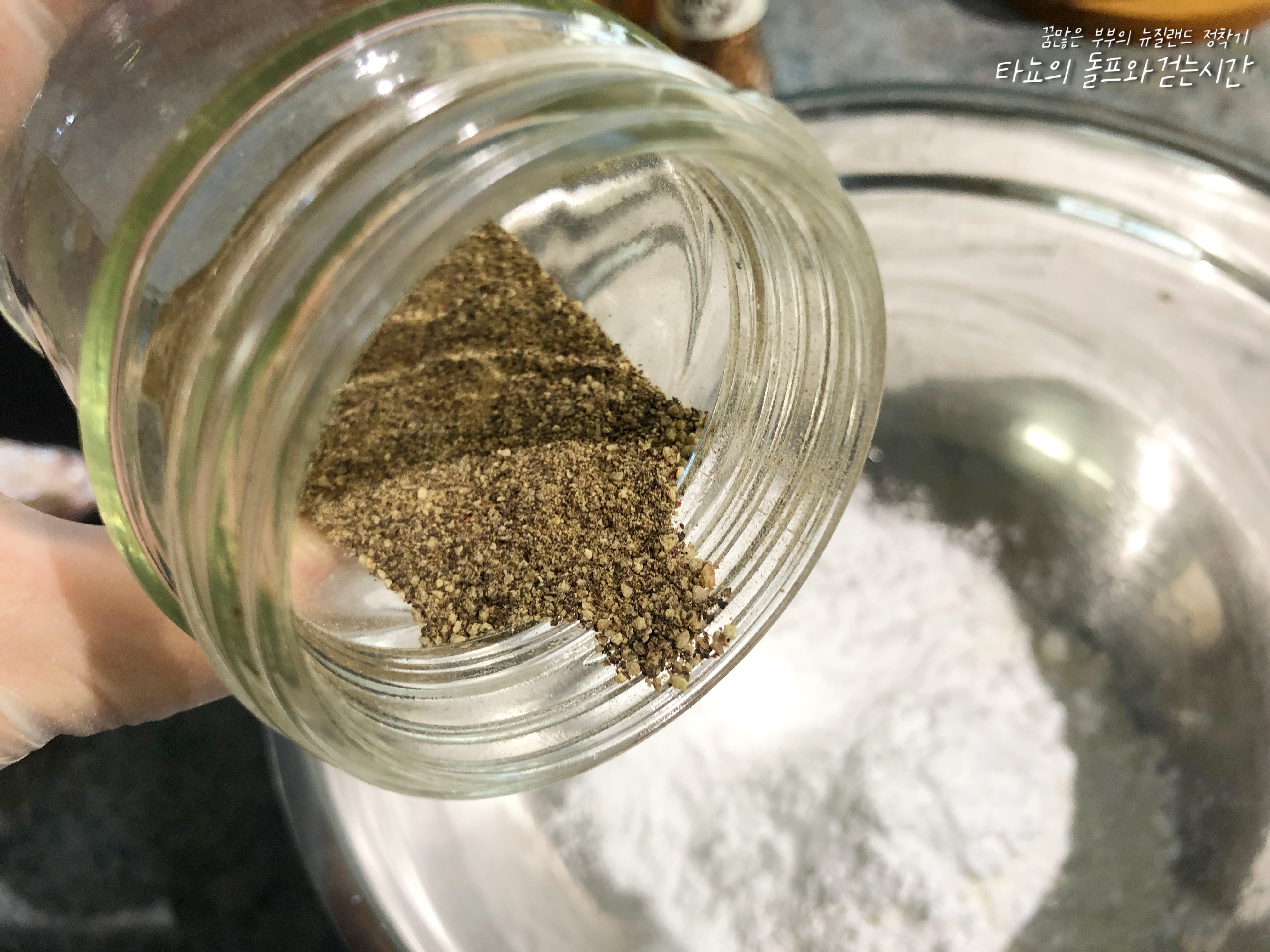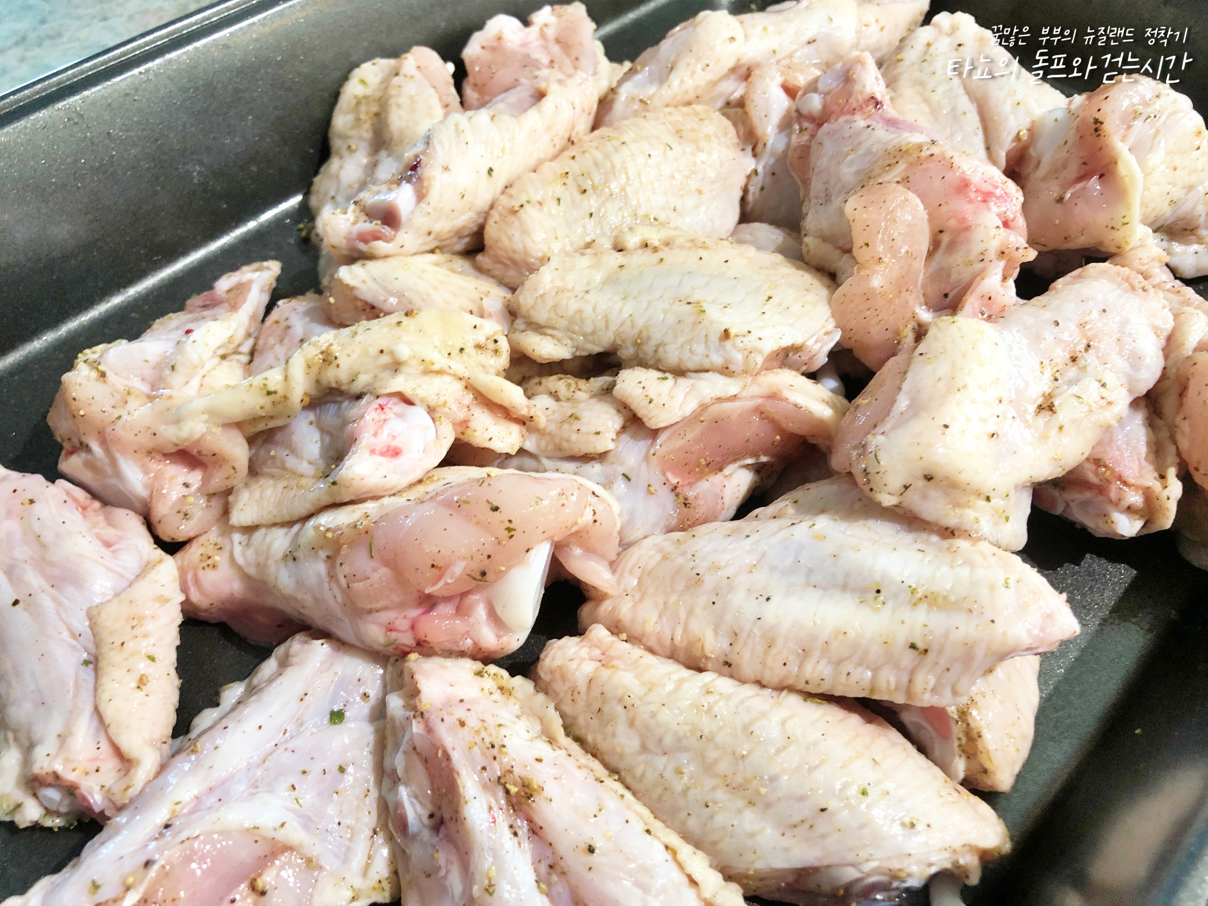 잡내를 없애기 위해서 우유에 재우는 분들도 많으시지만, 당장 치킨을 먹어야겠고 미리 준비하지 못한 저는 그냥 바로 염지에 들어갔습니다. 뒤늦게 알았지만 백종원님의 양념치킨 소스 만들기 영상에서도 우유에 재우는 게 별 효과가 없다고 그냥 안 해도 된다고 하시더라고요. 크게 공감하며 고개를 끄덕였답니다. 염지는 소금과 후추로 했습니다. 소금은 조금 적은가? 싶은 정도로 뿌리는 게 좋습니다. 반죽도 짭조름하고 소스도 찍어먹어야 하는데 닭고기 속까지 짭조름하면... 뭐, 맥주나 콜라를 부르는 맛일 것 같긴 합니다.