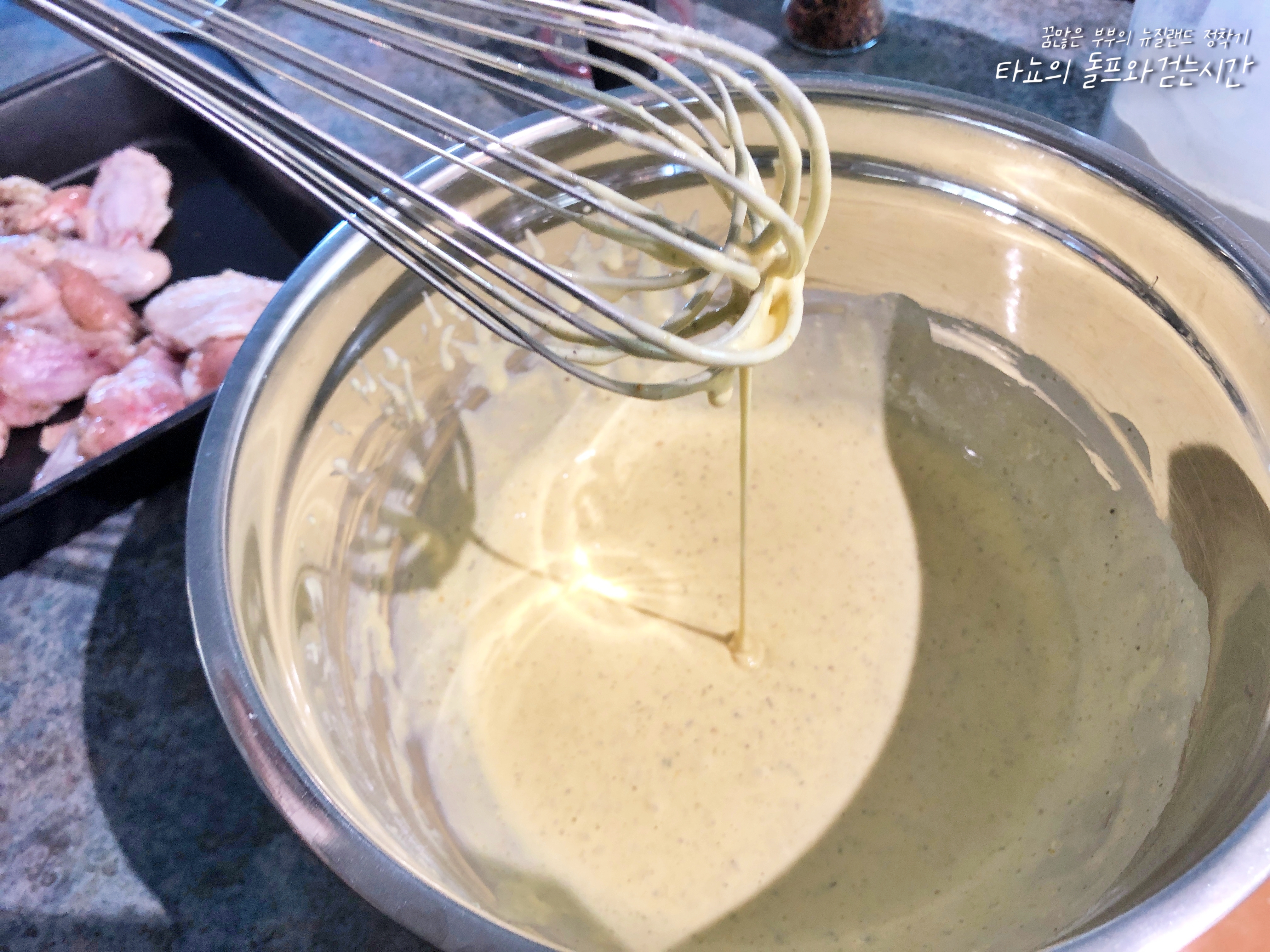 미리 준비한 모든 재료를 한 번에 넣어 잘 섞었습니다. 반죽이 또르르 떨어질 정도로 만들었는데요. 혹시 치킨 튀김 옷을 두껍게 입히고 싶으신 분들은 물 양을 약간 줄이시면 됩니다. 반대로 튀김옷을 입은 듯 안 입은 듯 아주 얇게 입히고 싶다면 약간 더 묽게 하셔도 됩니다.
